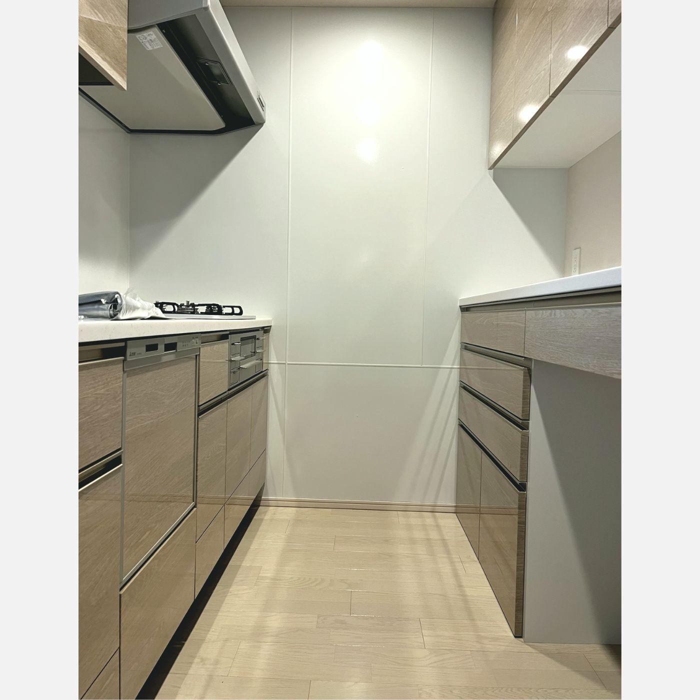 扉面材はキッチンと同じ色柄を選定いただき、ライン取手もキッチンと同じ品番で揃えました。