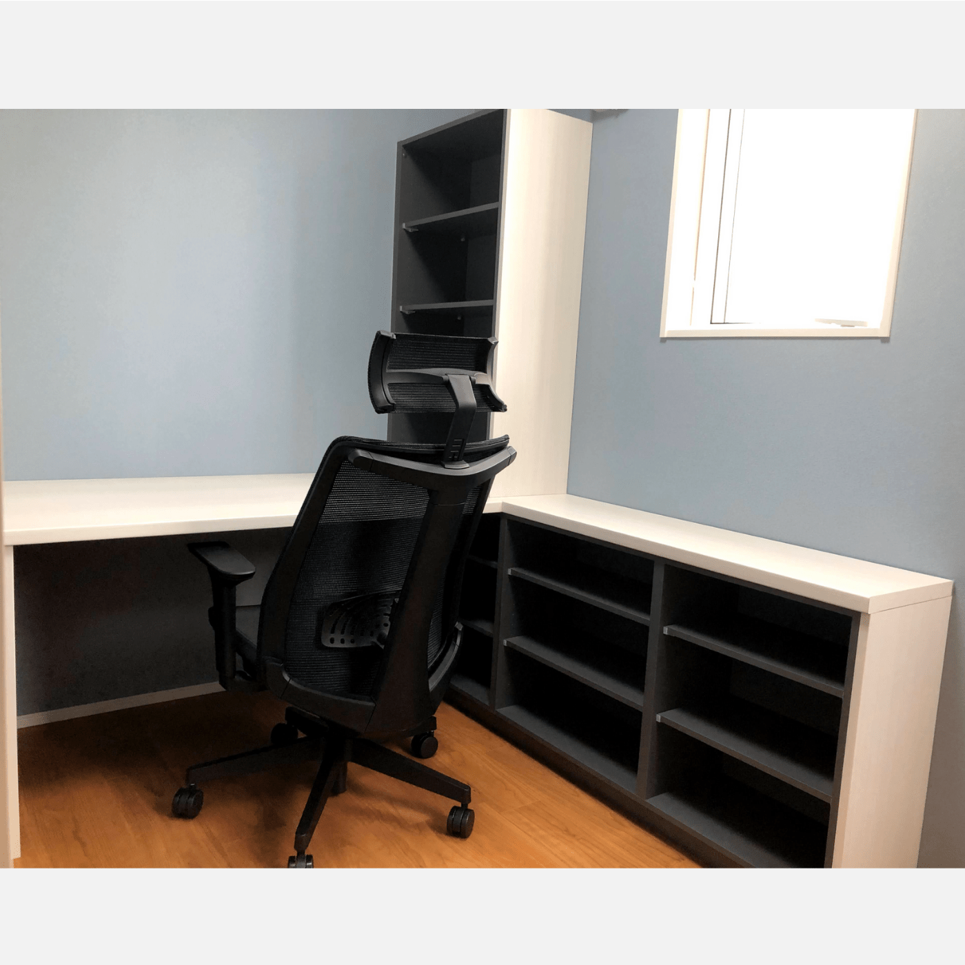 オフィスの角を有効活用!こだわりサイズの本棚収納