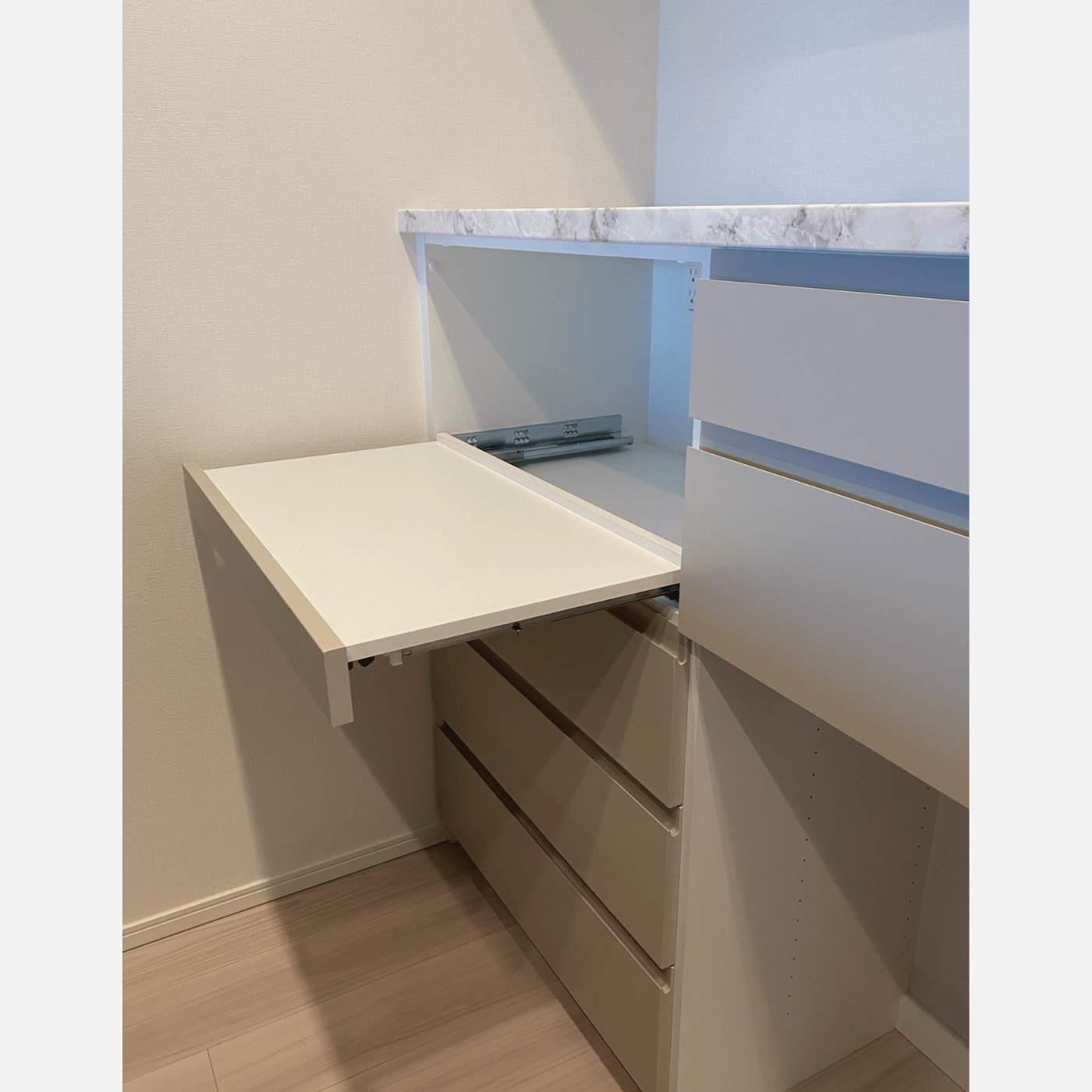 コンセントより高い120cmの位置に天板を設け、下台の引出しを多く確保しました。明るい色の面材で統一し、柔らかく優しさのある空間に仕上がりました。