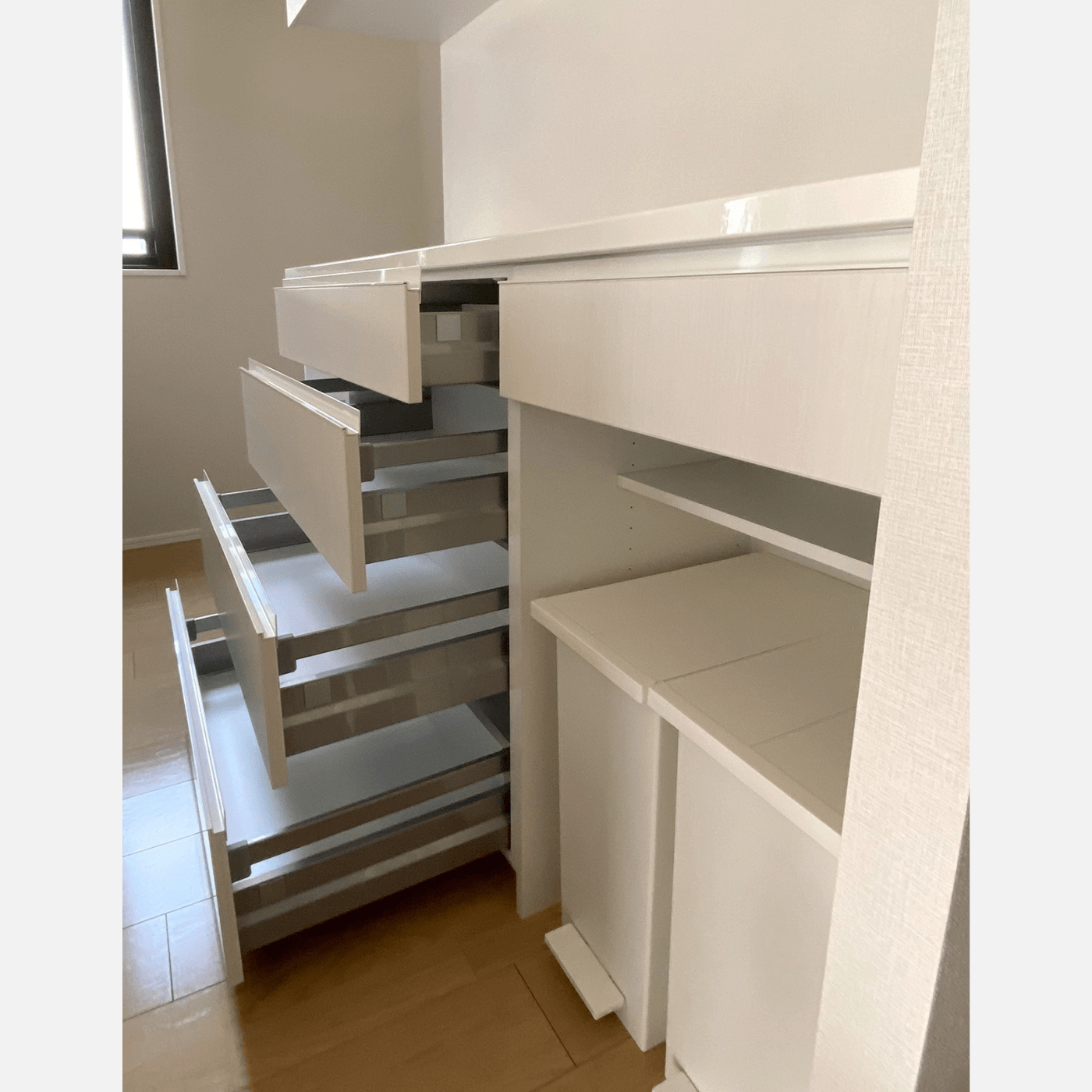 KEYUCAのLサイズゴミ箱が2つ置けるよう、ピッタリサイズの設計です。ゴミ箱上には奥行きの浅い可動棚を設け、ゴミ袋などのストックが収納できるスペースを設けました。面材はホワイト・アイボリーで統一し、明るく圧迫感の無いキッチンに仕上がりました。