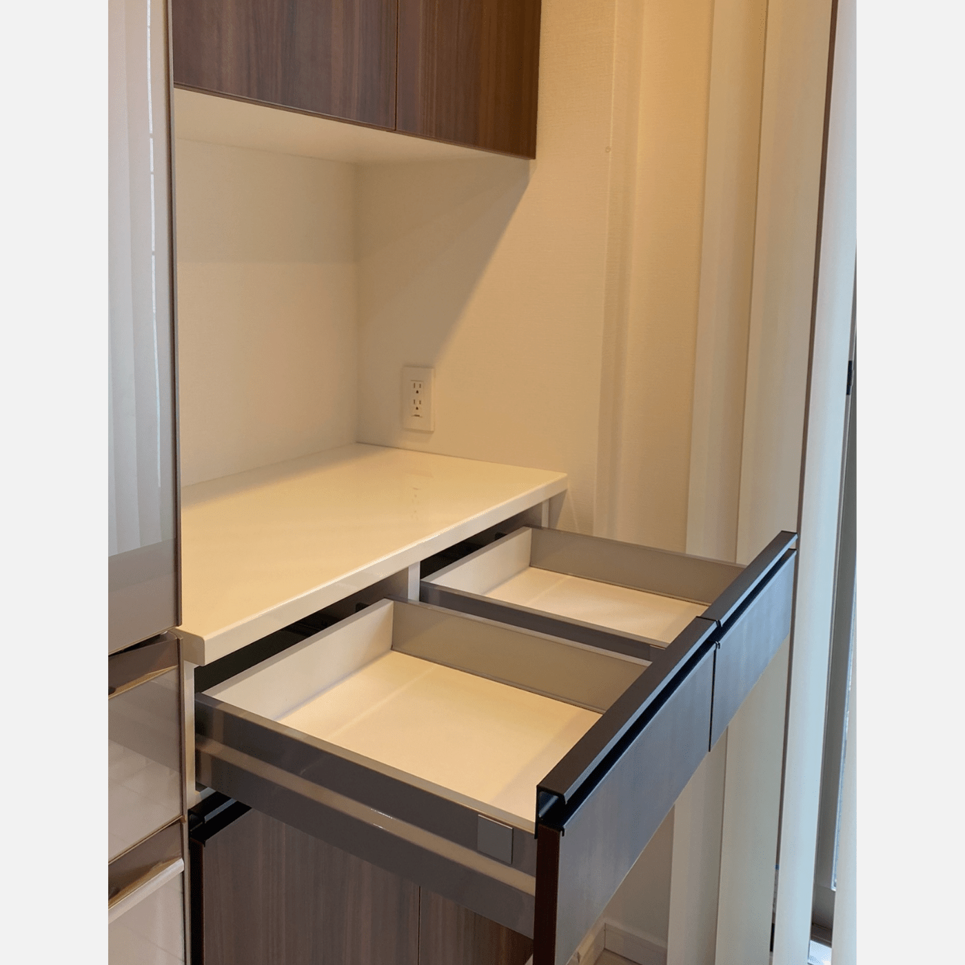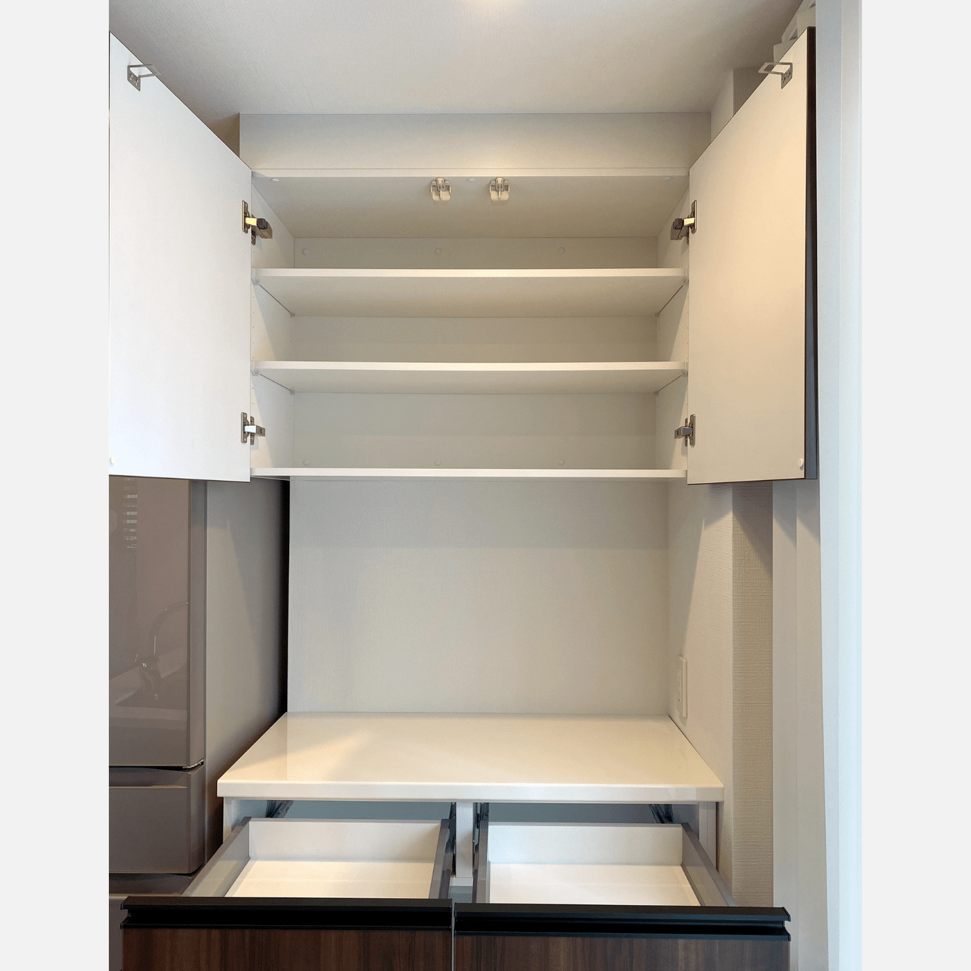 天板下にある高さ10cmの引出しは、カトラリーや豆皿、小さなコップ、ラップ等の細々した物が収納できます。その下にある両開き扉と吊戸棚には、3cmごとに高さを変更できる可動棚を合計4枚設けました。