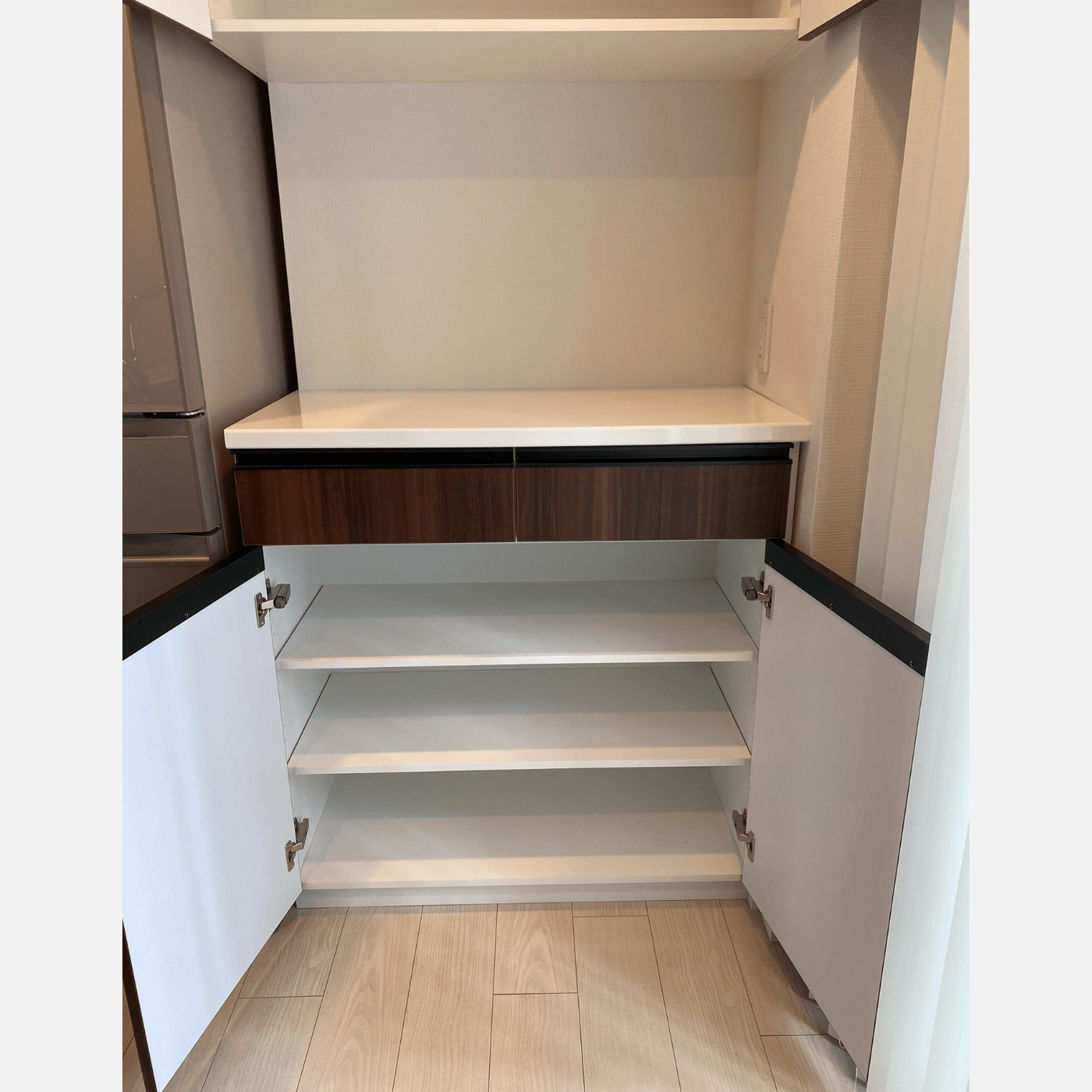下台に開き扉を設けました。可動棚を使ってカスタマイズ自由なカップボード