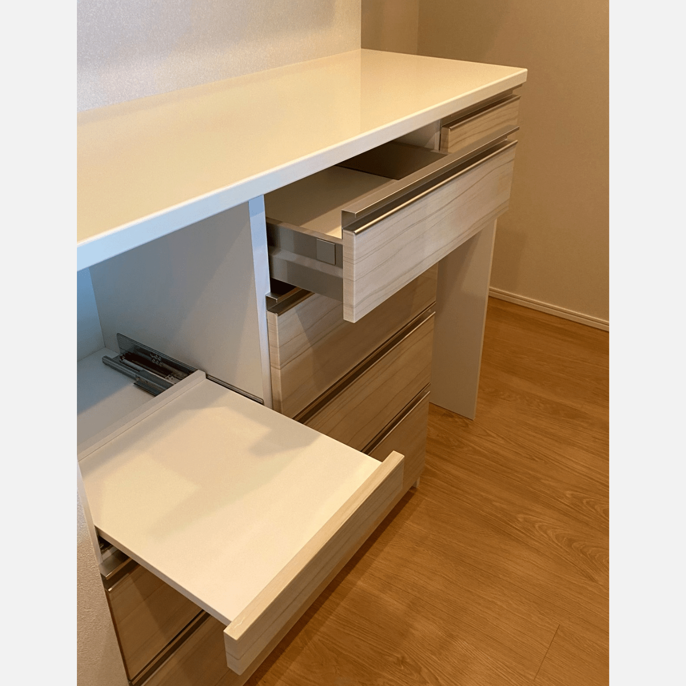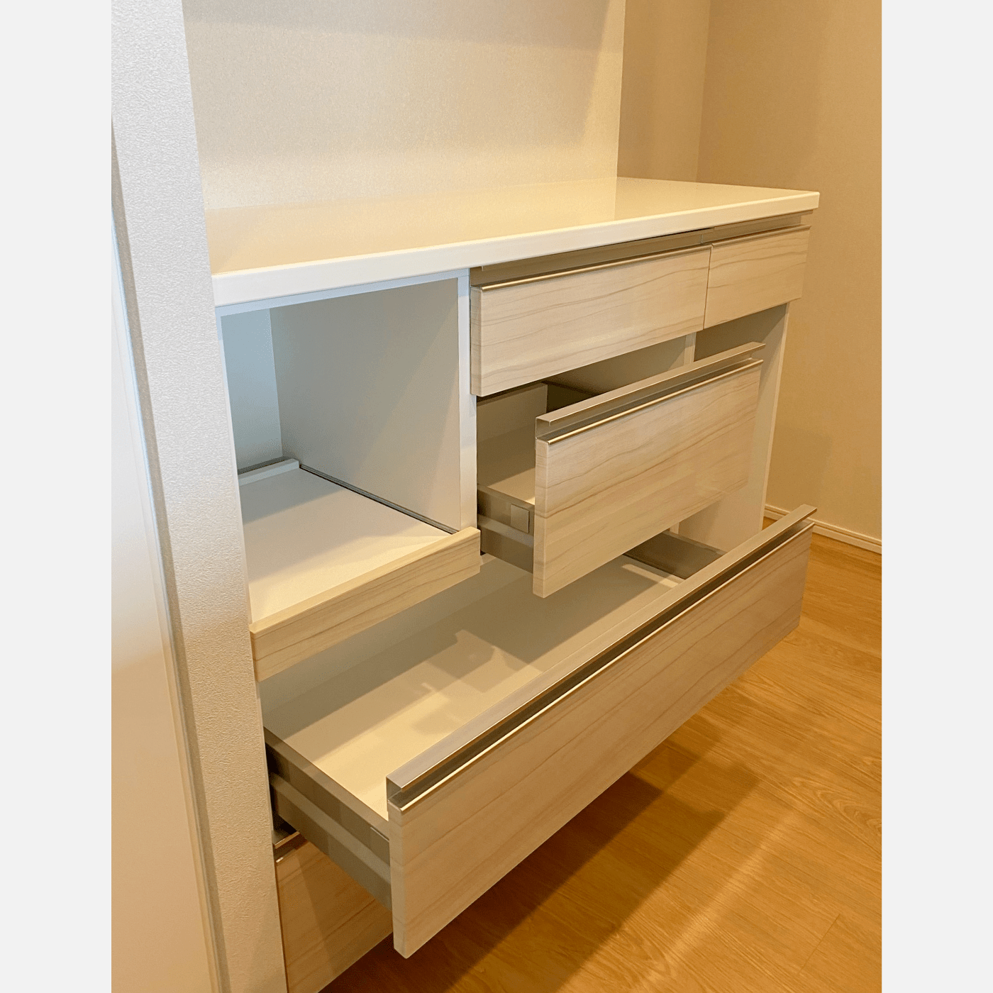 炊飯器・ゴミ箱に合わせたサイズ設計です。引出し収納を最大まで確保したカップボード