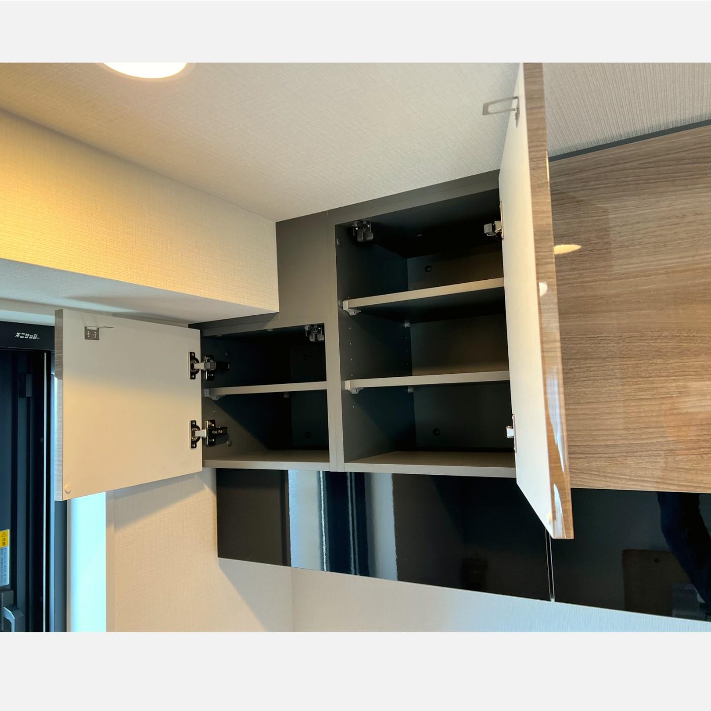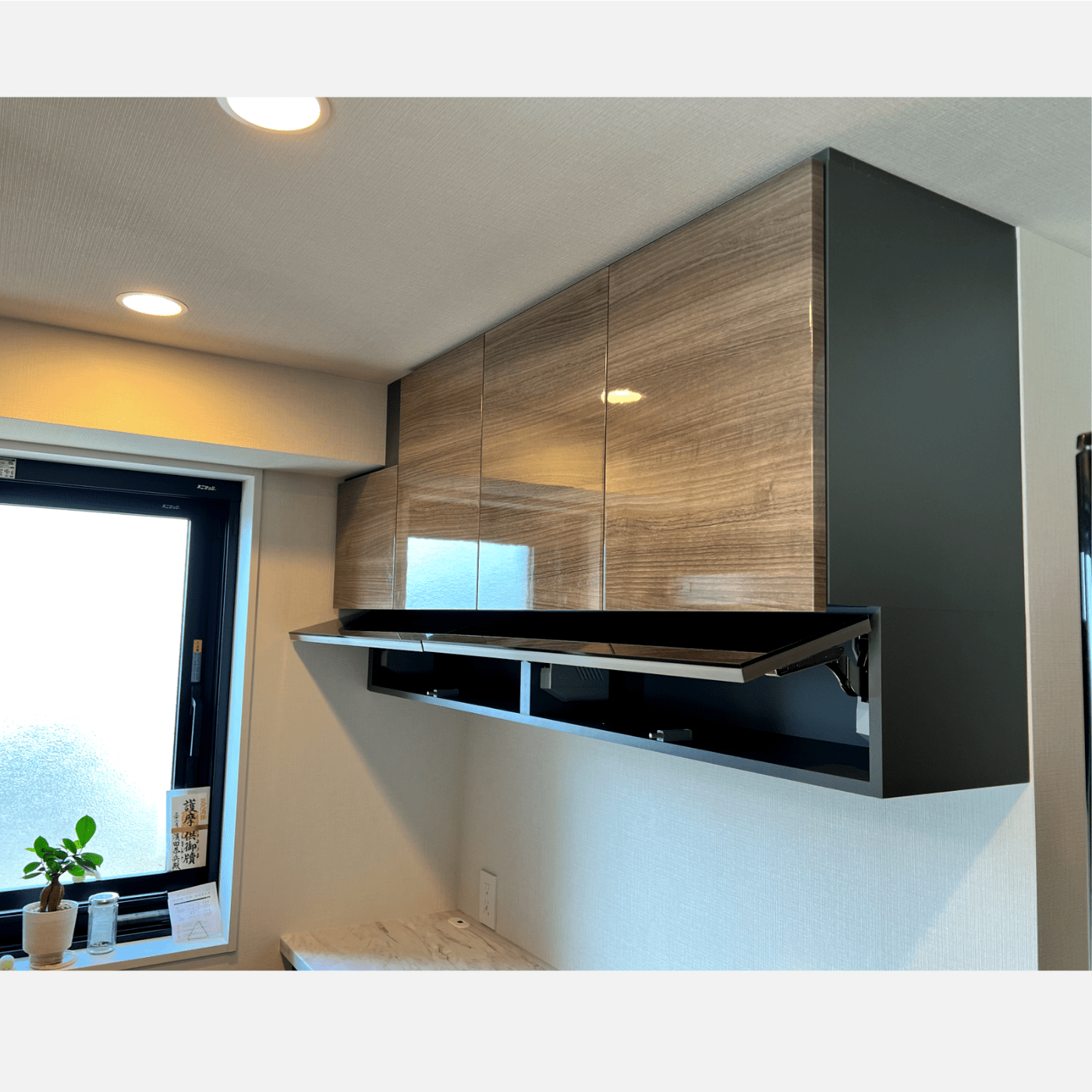 木目柄ブラウンの扉面材はキッチンと同じ品番を使用し、ダストスペースはご要望に合わせてKEYUCAのLサイズが2個置ける幅を取っています。吊戸棚の下部には調味料など小さなものが収納できるよう、奥行きの浅い収納を設けました。カウンター上での作業中も頭がぶつからず、扉を鏡面仕上げのブラックにしたことで、冷蔵庫とも調和するデザインに仕上がりました。