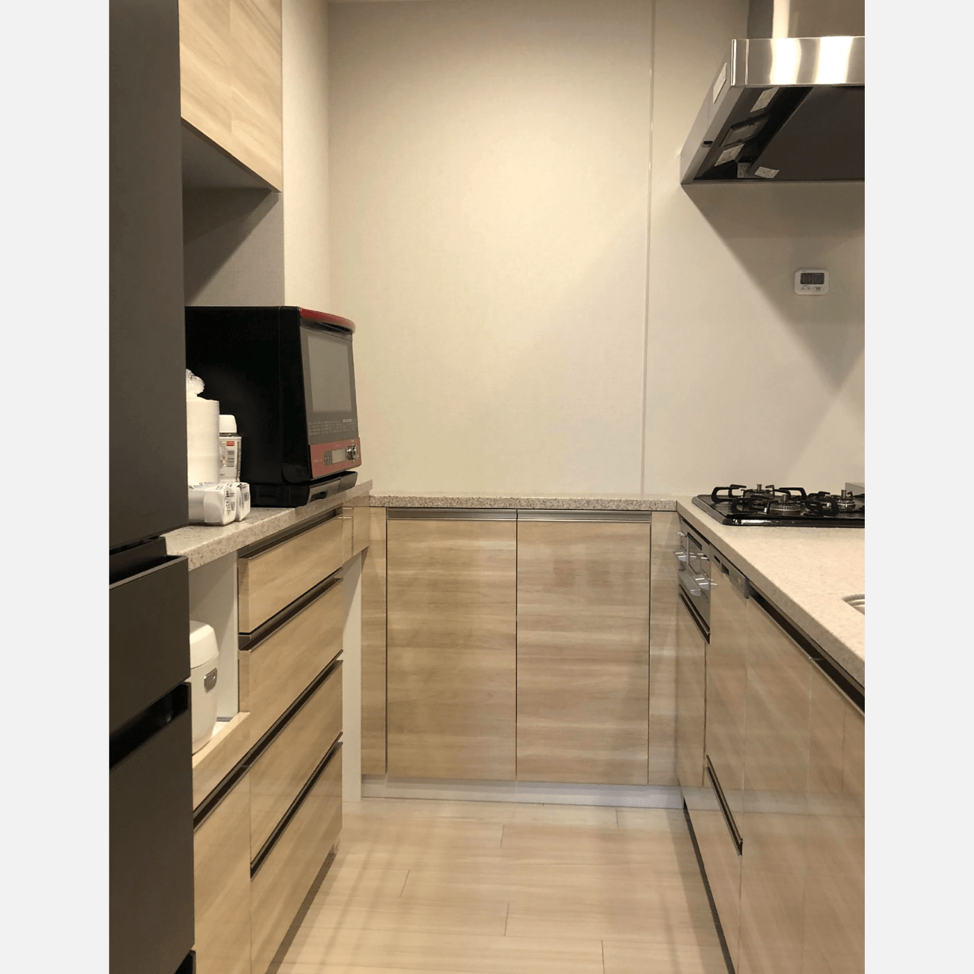 窪んでいる冷蔵庫スペースが広かったため、冷蔵庫のギリギリまでカップボードを延ばした設計です。カップボード右下のダストスペースには、点検口に合わせたサイズで切欠きを行っています。扉はキッチンと同じメラミン素材の面材、天板もキッチンと同じ人工大理石の面材を選定いただきました。キッチンとカップボードの間の壁に配管が現れており、隠しながらその上を有効活用できるように奥行き約15cmの収納を設けています。