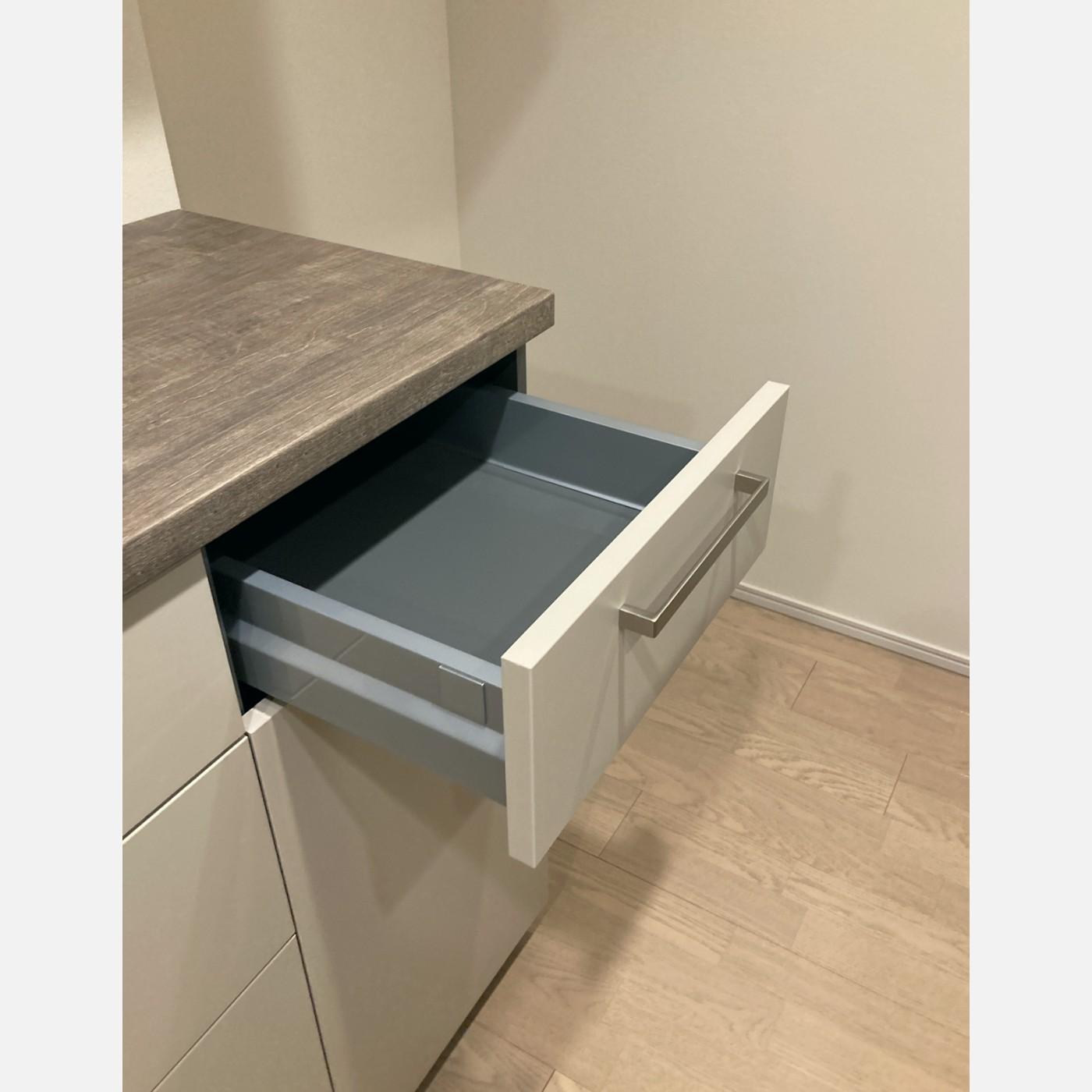 下台には大小合わせて引出しが5段あり、多様な収納方法ができるよう開き扉の収納も設けています。ダストスペースは扉を閉めたままゴミ箱のペダルを踏んでごみを捨てられるよう、扉の上下を開口した仕様としています。扉面材はキッチンと同じ品番を選定いただき、取手と天板もキッチン同様の品番です。薄いグレーは圧迫感の無い印象を持ち、ダウンライトの光も優しく反射して明るいキッチン空間が実現します。