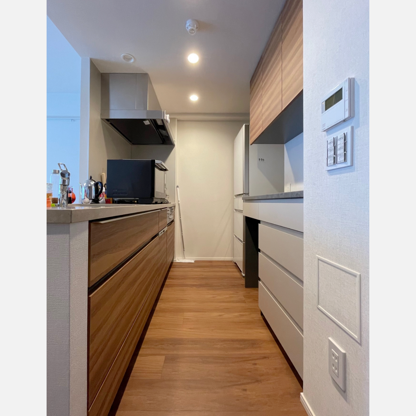 下台の収納量を最大限確保するため、天板をコンセントプレートギリギリの高さに設計しています。奥行きは右側壁にピッタリ。オーダー家具ならではの収まりです。吊戸棚はキッチン同面材を使用して統一感を出しつつ、下台は単色グレーの扉面材で落ち着いた雰囲気に仕上がりました。本体の色はグレーを選定いただいたことで、濃い色の天板も馴染みます。