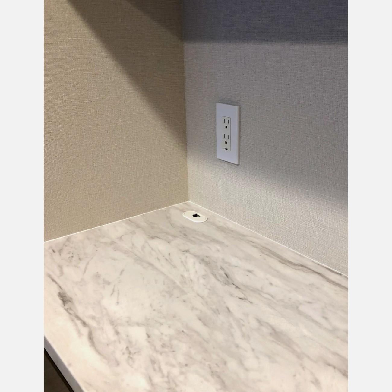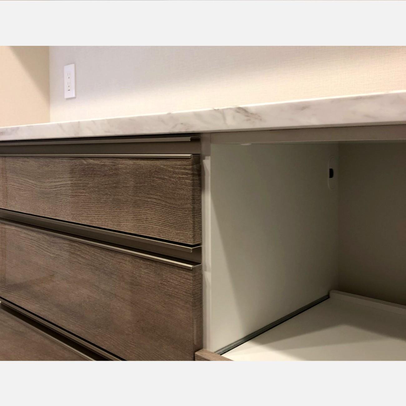 ダストスペースはキッチンの入口側に設けて、家事の最中でもダイニングやリビングからのアプローチしやすい動線にしています。下台のメインは引出し収納ですが、炊飯器スライド棚の下に収納の自由度を上げるため、開き扉にしました。扉とライン取手は、キッチンと全く同じ品番の物を使用し、天板はメラミン素材の色柄を選定いただきました。