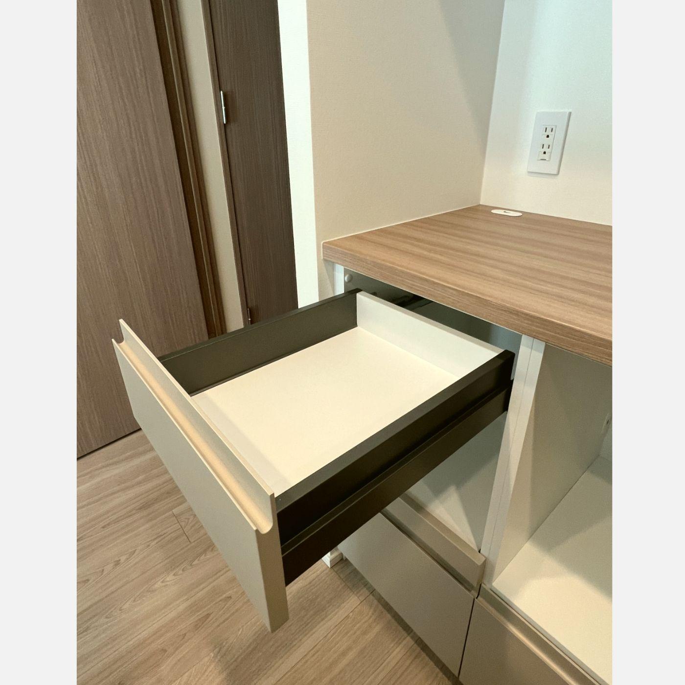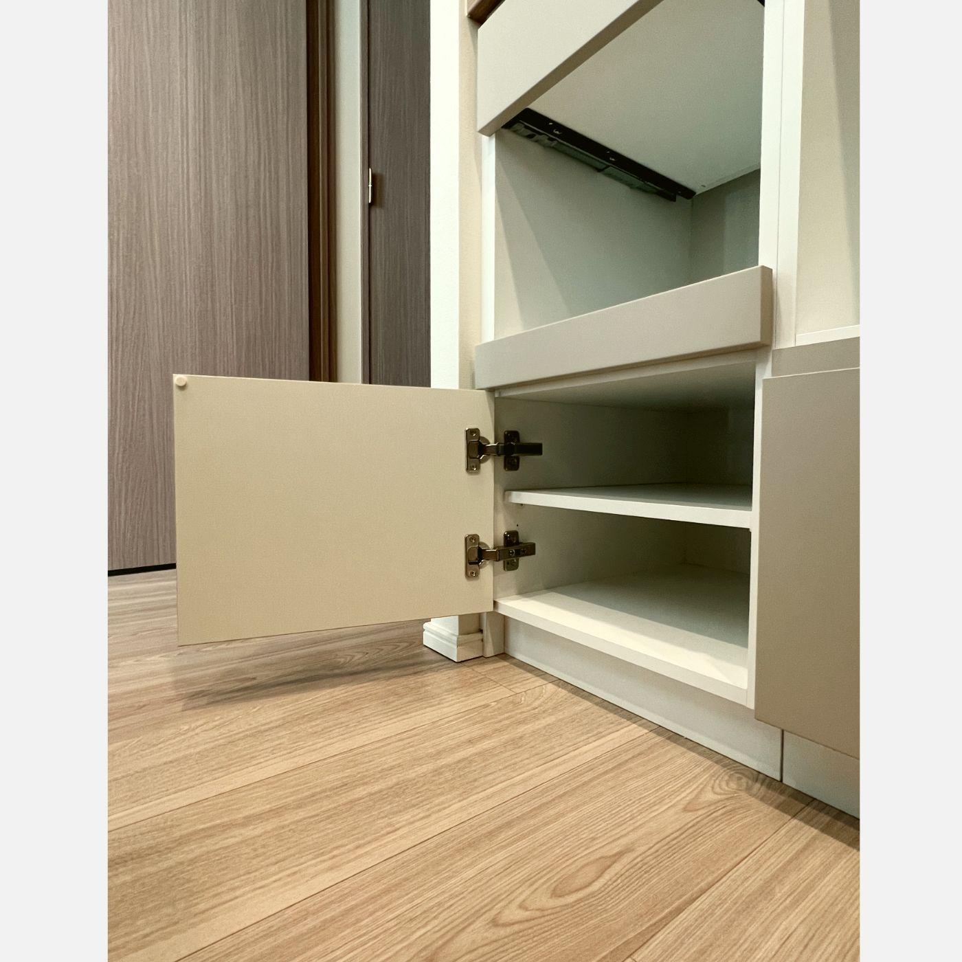 開き扉や引出を組み合わせた複雑なプランですが、スッキリした見た目に仕上がるように横のラインを意識したサイズ設計にしています。