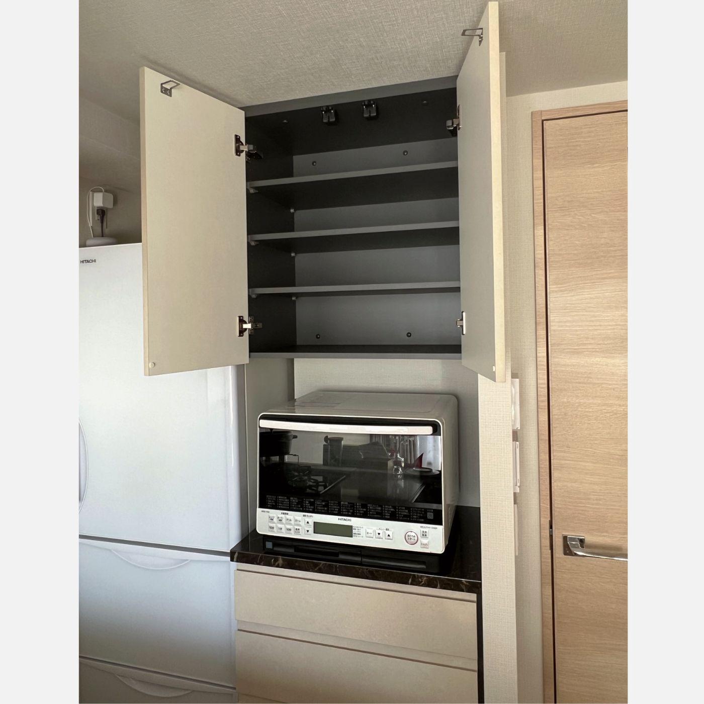 収納量を確保するため、標準サイズより奥行が大きい吊戸棚とハイカウンターの下台を組み合わせました。下台の開き扉には土鍋やパスタ鍋、引出しにはコップ類やカトラリーが収納可能です。