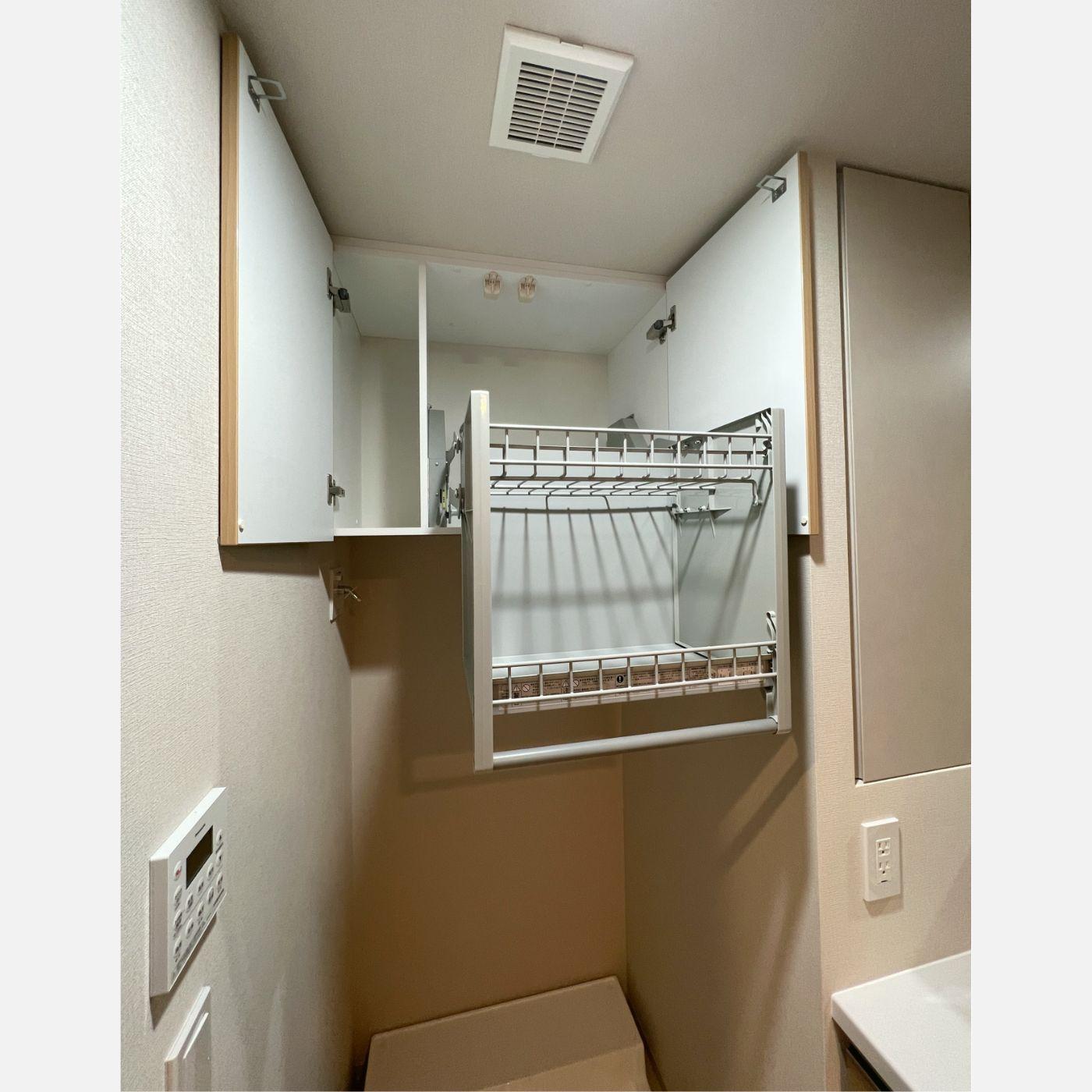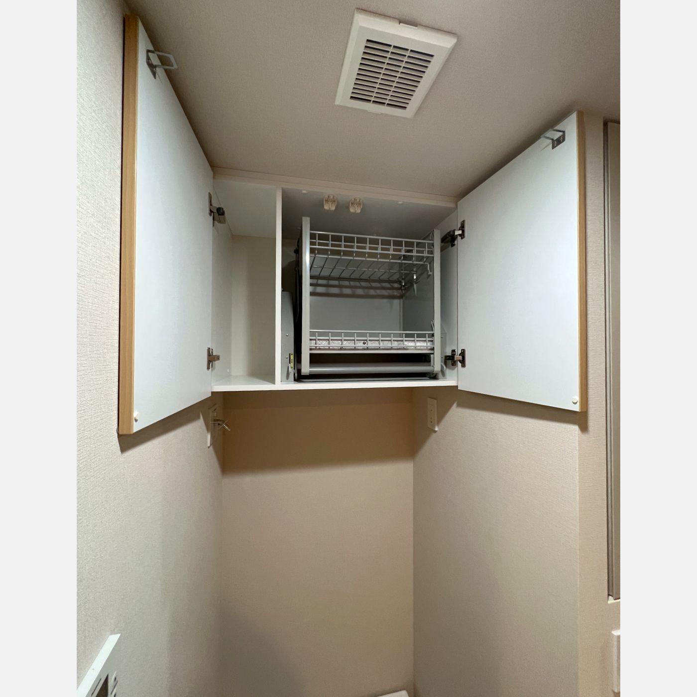 洗濯機上の空間に合わせて、ピッタリサイズで収納を設けました。吊戸棚の中には、ご要望に合わせてスムースダウンを取り入れています。高い場所でも、踏み台を使うことなく物を取り出すことができます。