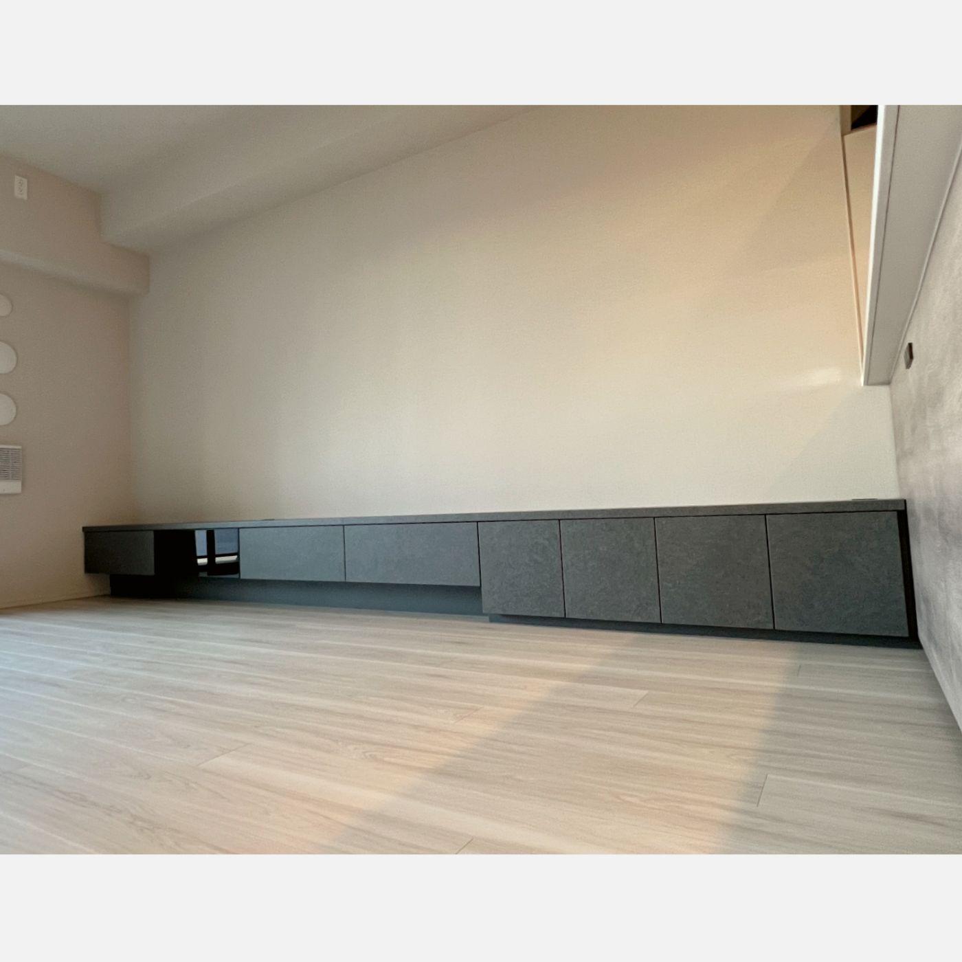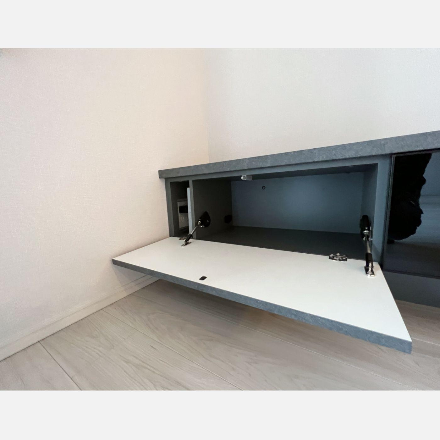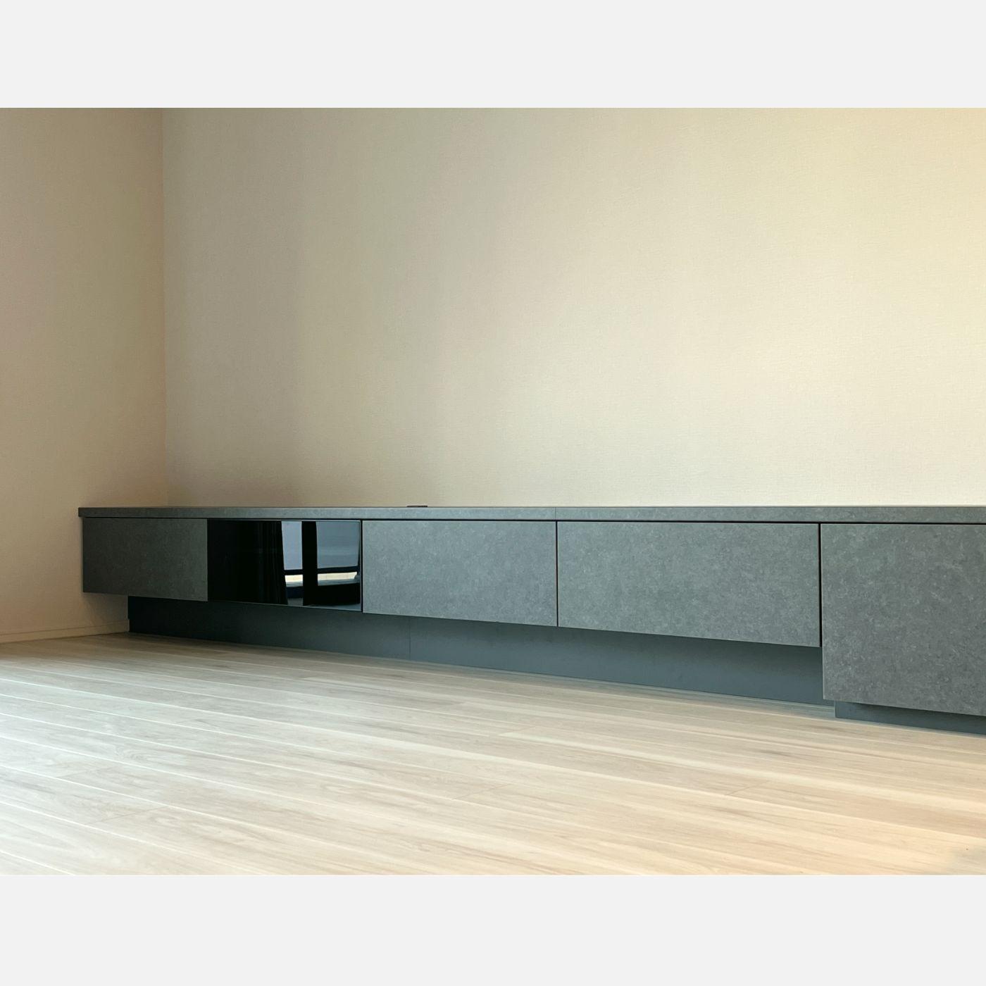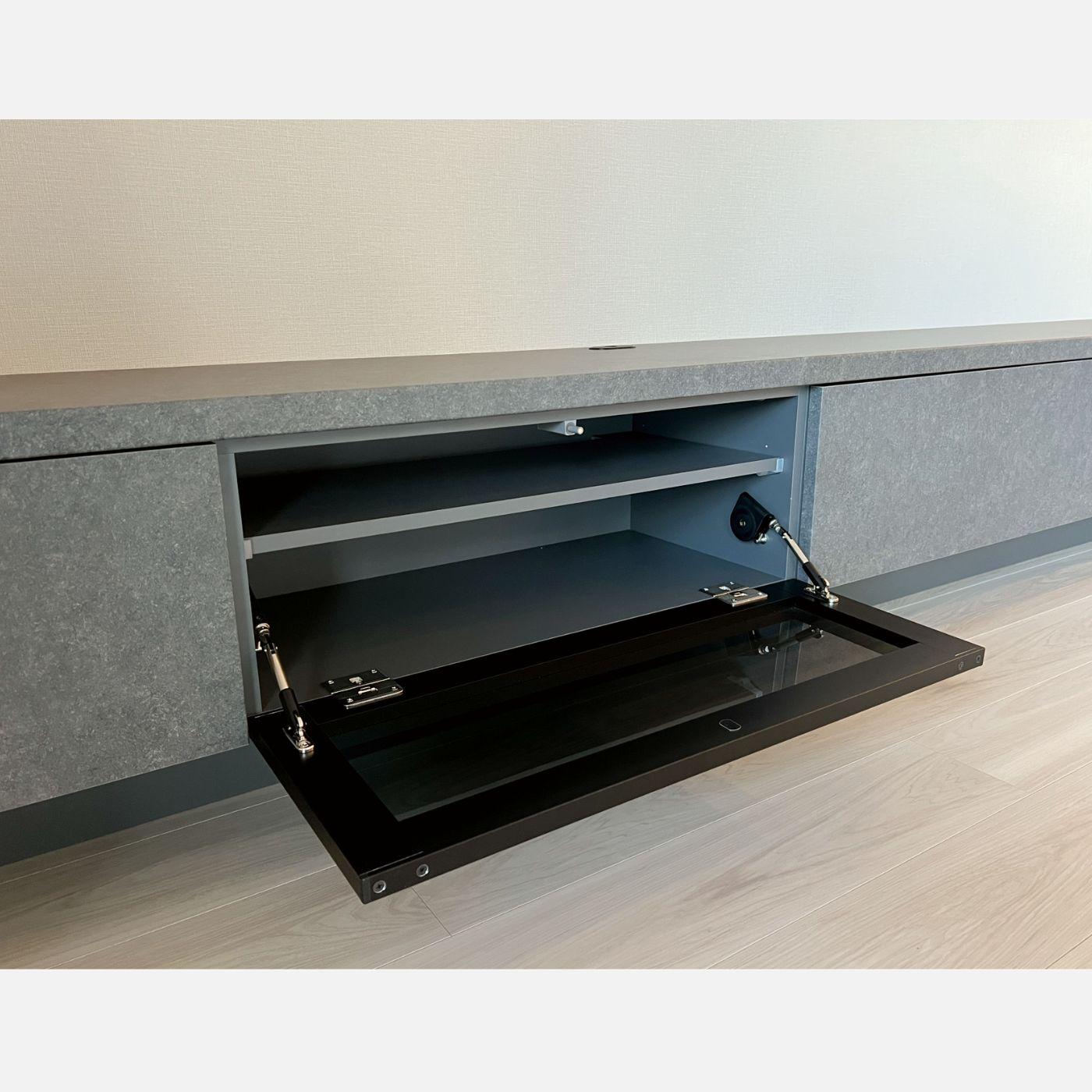 扉・天板には、石目・抽象柄の品番を選定いただきました。扉の一部にブラックのガラス扉を使用し、リモコンの赤外線を通すことができるようにしています。
