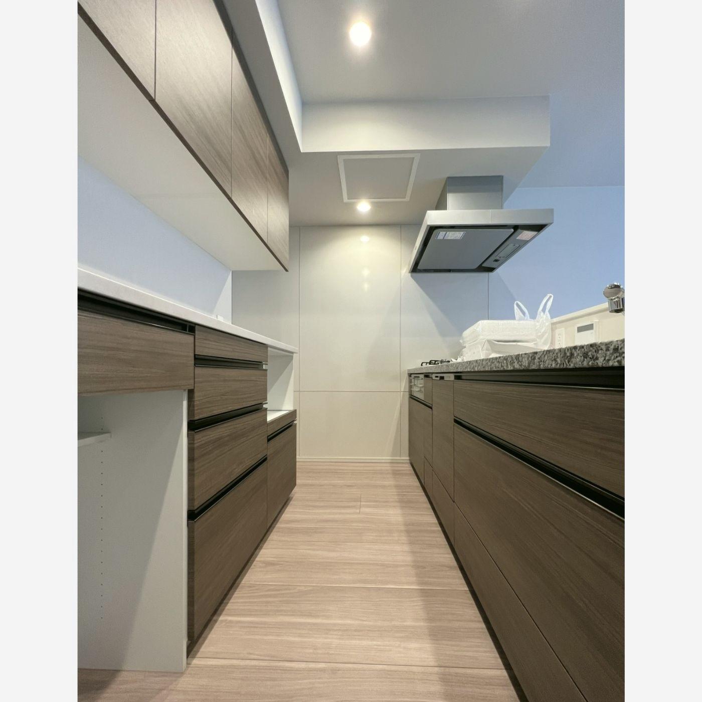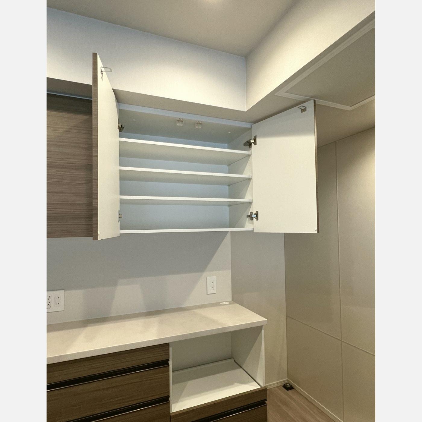 収納量をより多く確保するため、下台は高さ97cmのハイカウンター、吊戸棚はカウンター上空間を狭くして高さを持たせています。吊戸棚の奥行は、使用予定のストッカーが収納できるサイズ設計です。