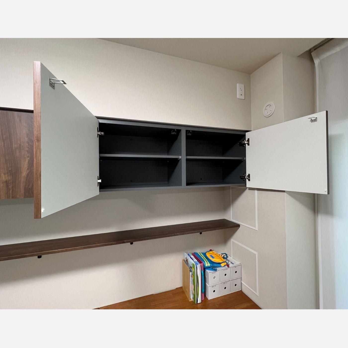 扉付きの収納は、梁の奥行・点検口の高さに合わせて設計しました。本など重量のあるものを収納できるよう、耐荷重を考慮した設計にしています。