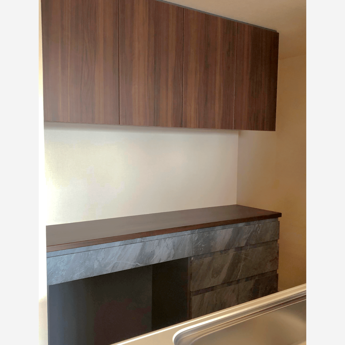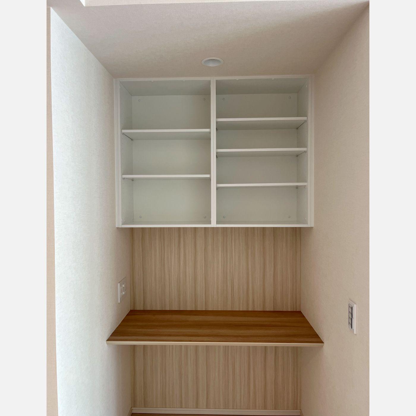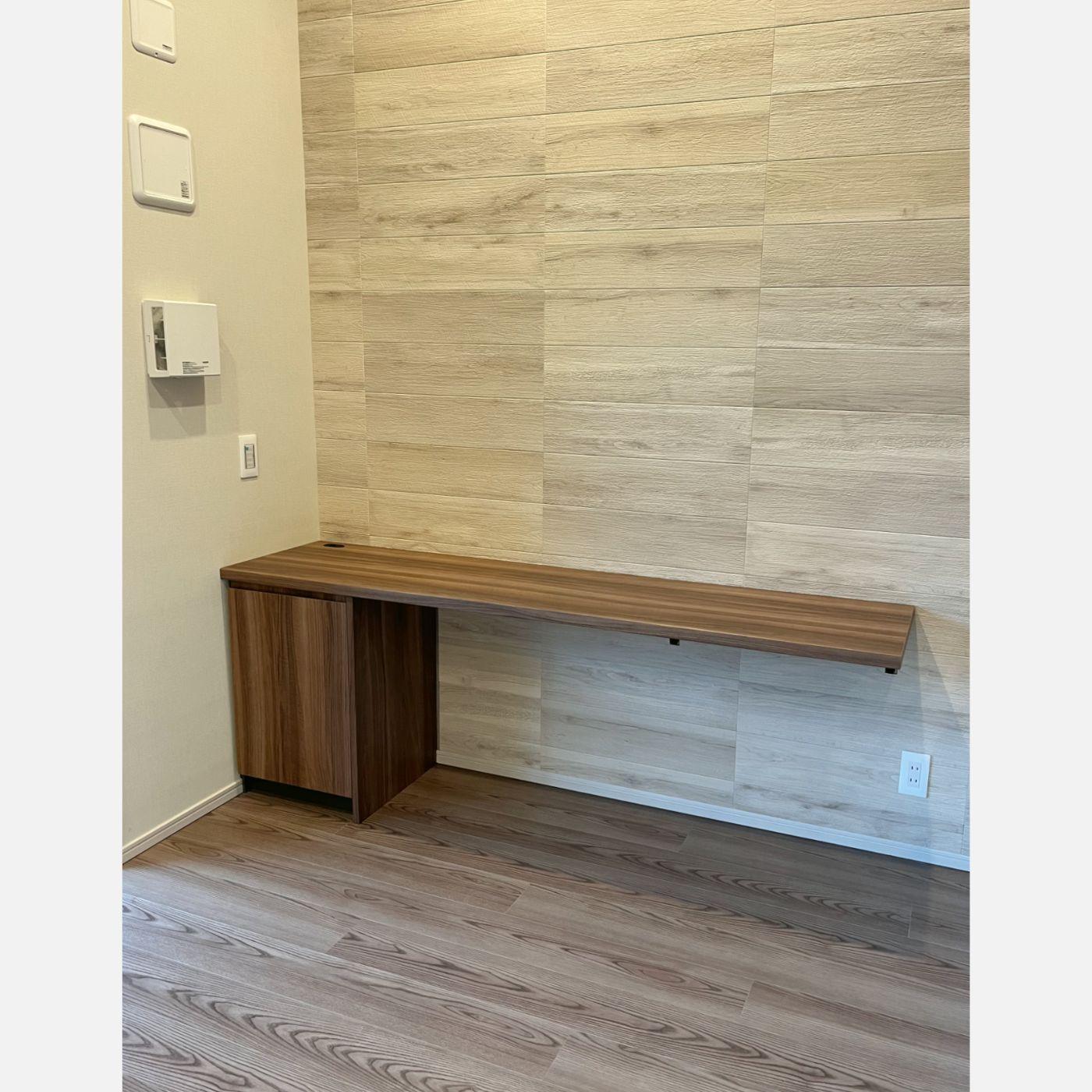 リビングの一角に、設けたデスク。左側の袖机で既存コンセントを隠し、デスク上でコンセントを使えるように通線開口をしています。
