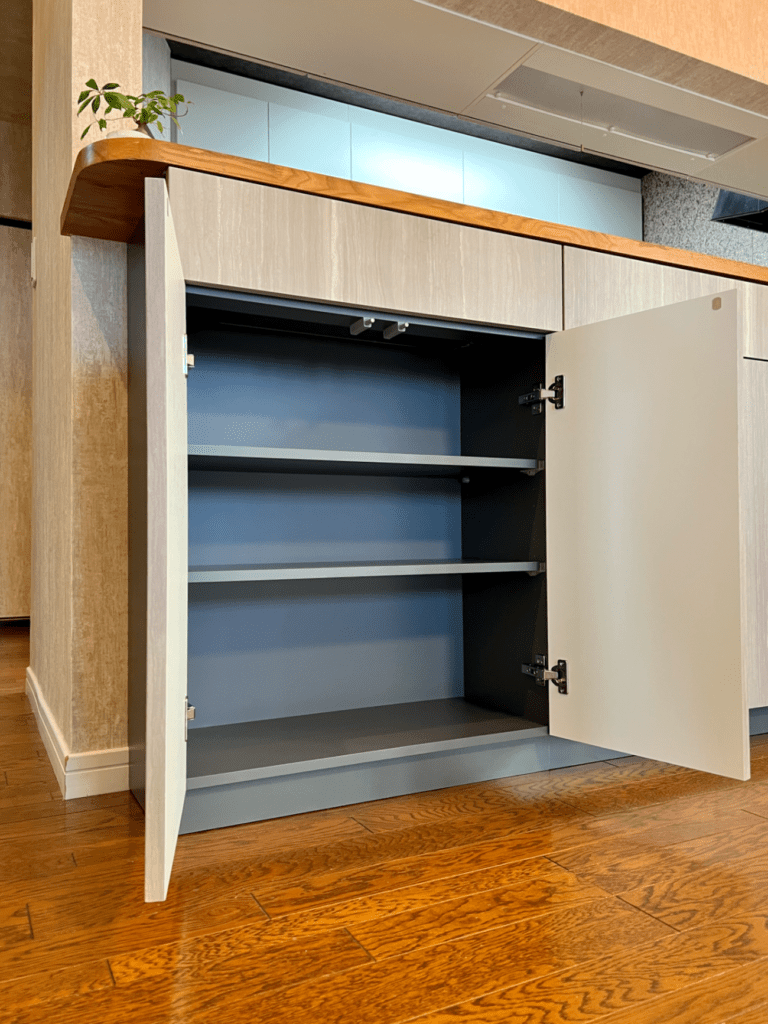 既存カウンターの下に引出しを3段設け、その下と右側トール収納は両開き扉の設計です。どちらも「プッシュオープン」の開閉方法を採用し、取手がないシンプルなデザインにしました。