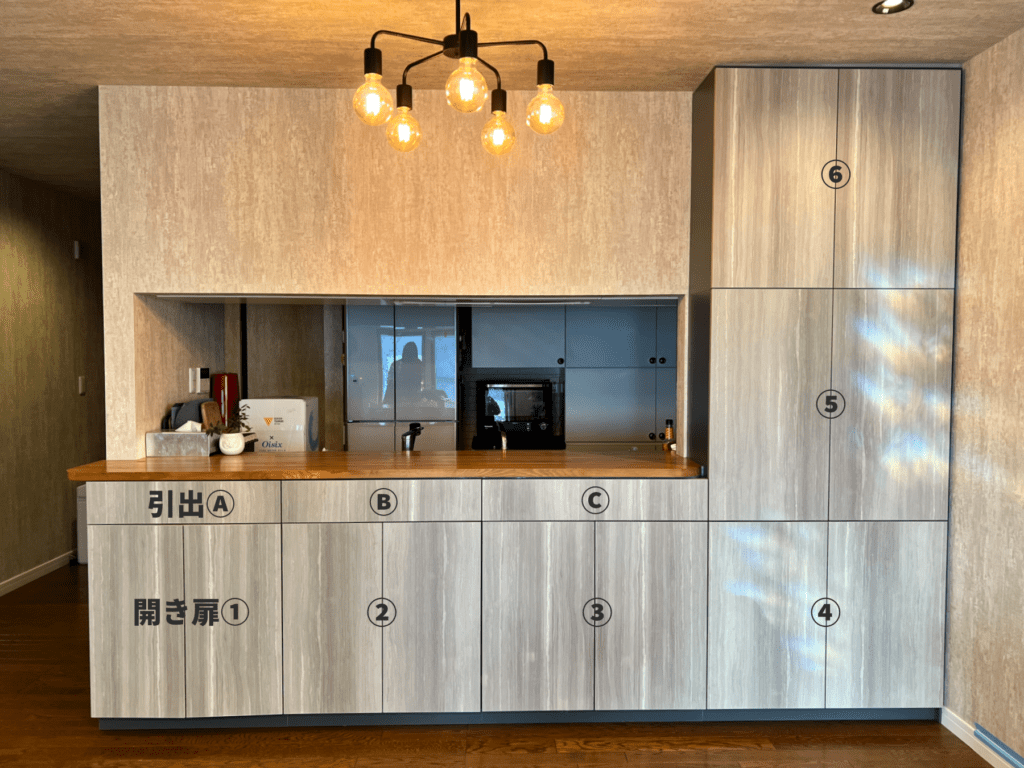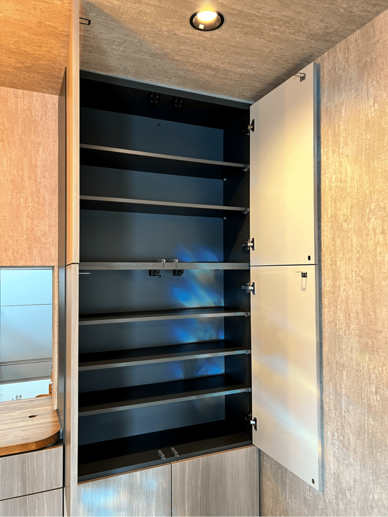 6箇所ある開き扉の中には、合計12枚の可動棚を設けました。可動棚は3cm間隔で上下に移動することができます。