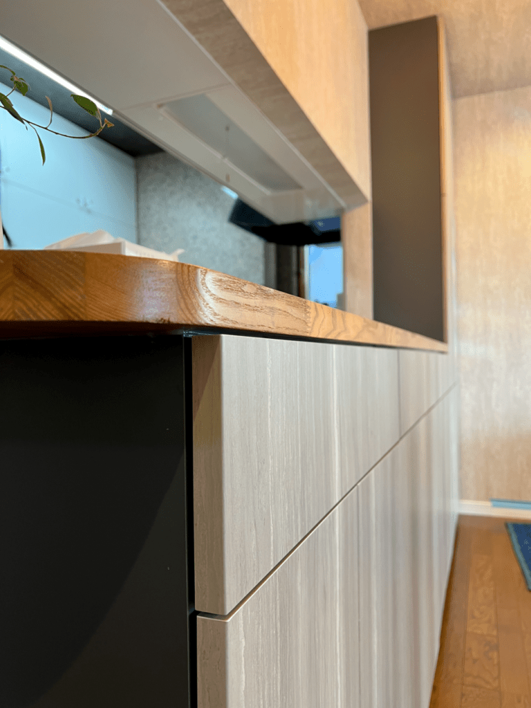 既存のカウンターは角が丸くなっており、その部分を避けて家具を取付けました。奥行きは既存カウンターにピッタリサイズです。デコボコ感がない仕上がりになりました。