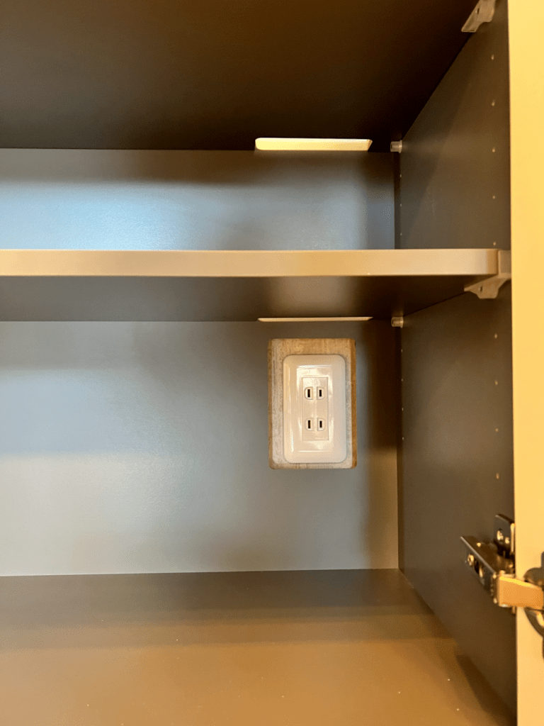 扉の中にあるコンセントプレートに合わせて、家具の本体背面を切欠きしています。