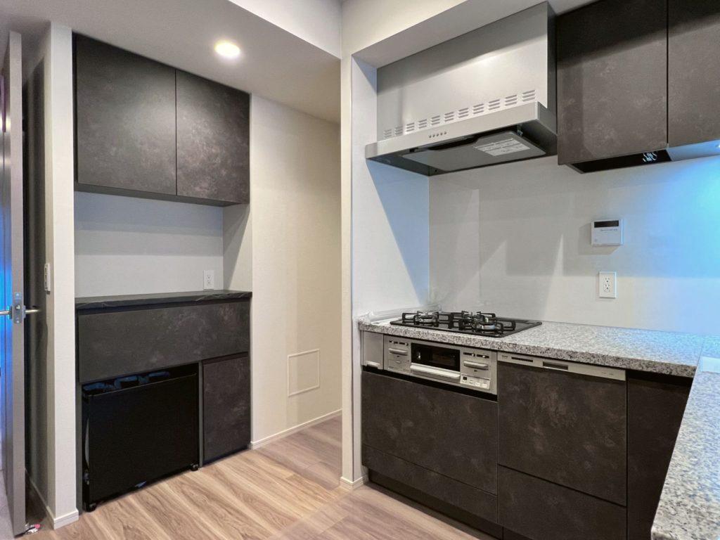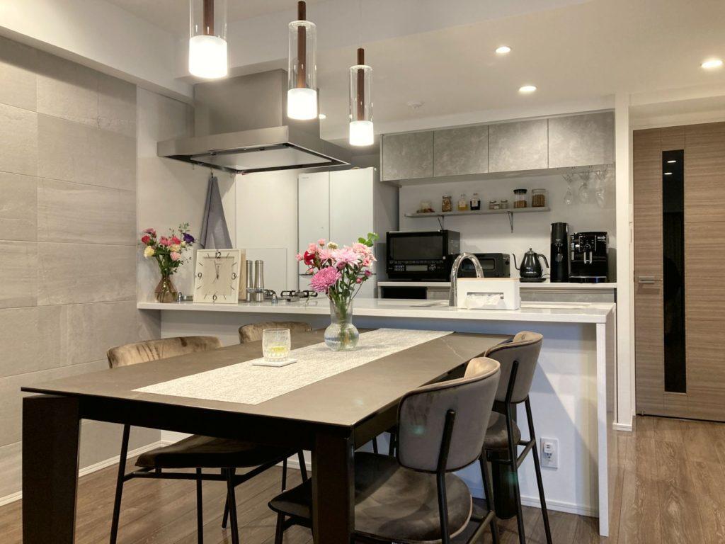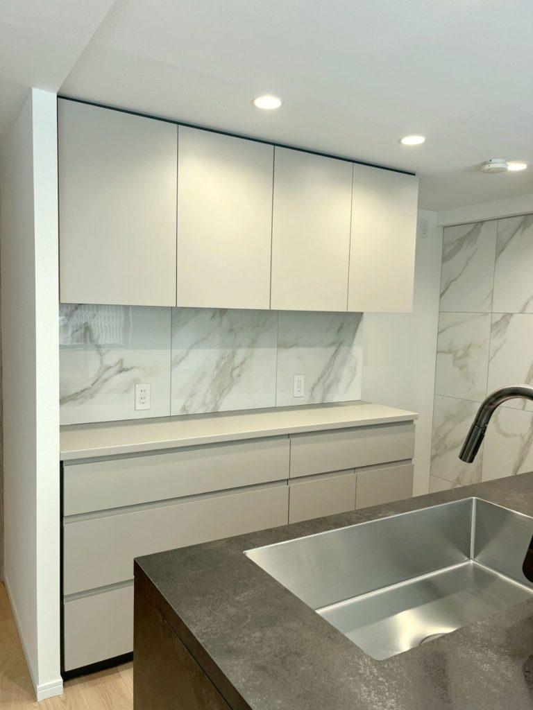 キッチン周りの壁紙に色柄のテイストを合わせた、カップボードです。壁面の石目調タイルと合う単色カラーを選定いただき、高級感がさらに増しました。写真手前に少し見えるキッチンはブラック系の色柄ですが、どちらもシックで落ち着いたテイストなので、チグハグ感もありません。