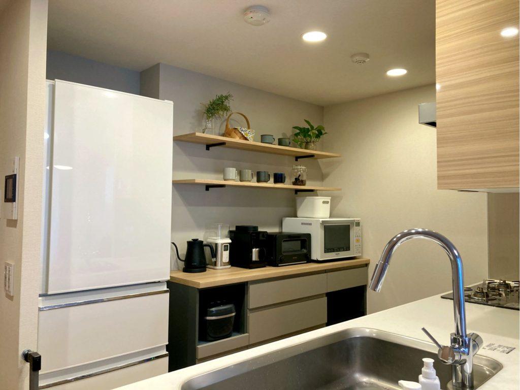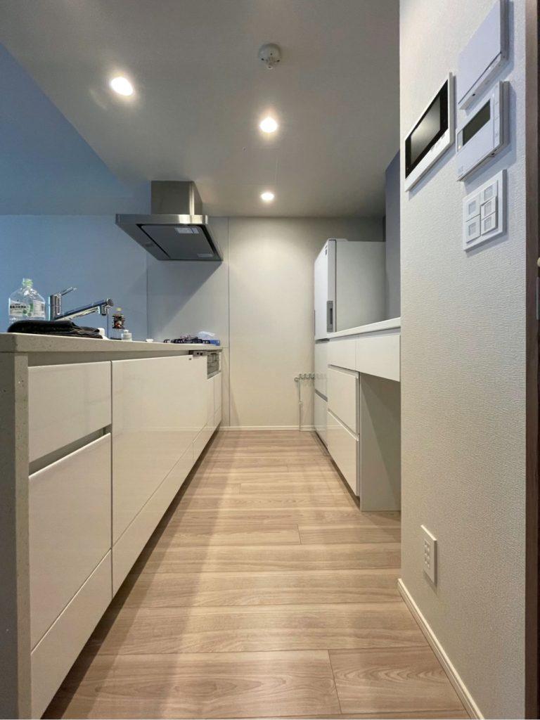 キッチン扉と同じく、ホワイトの面材を使用しています。しかし、キッチン扉は艶のある”鏡面仕上げ”、カップボードは艶の無い”マット仕上げ”の面材です。違う表面仕上げの扉が並んでいても、あまり違いは気になりません。