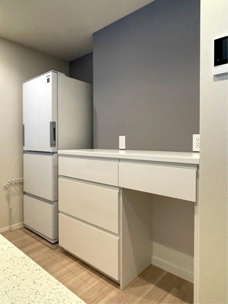 キッチンの隣に設置する事が多いカップボード。キッチン扉と同じ色柄を使用するのが主流です。