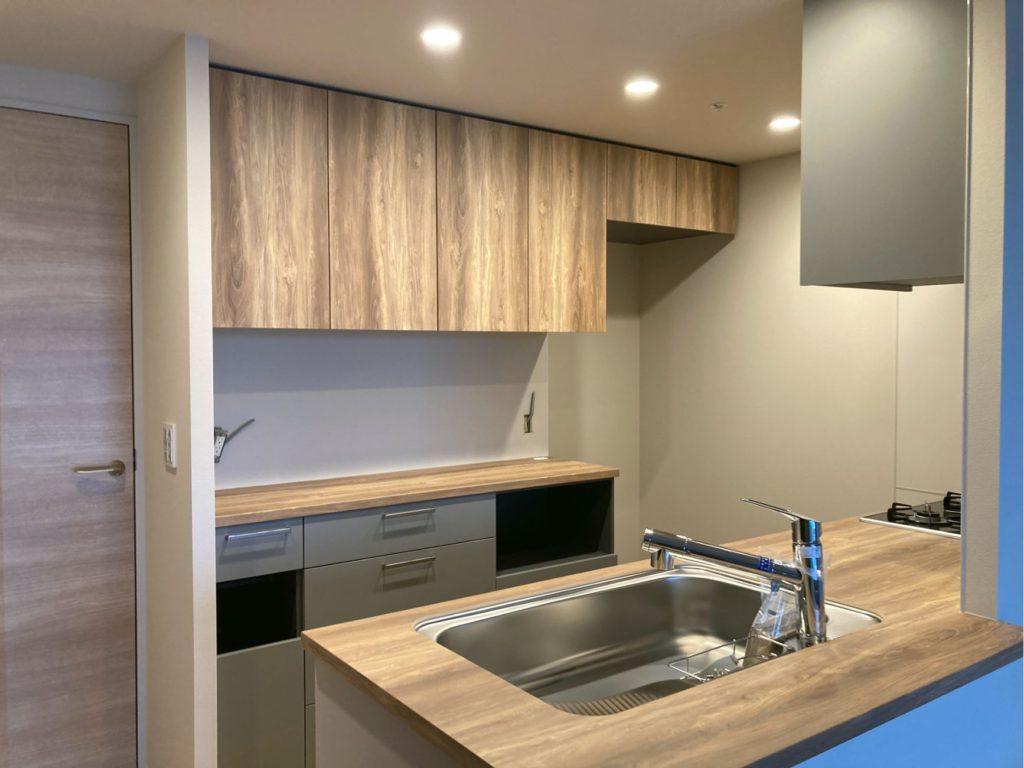 下台はキッチンと同じ扉・天板ですが、吊戸棚は天板の面材を採用しています。ダイニング側からよく見え、なおかつ色の面積が広い場所は、同じ色柄にすると統一感が生まれますね。