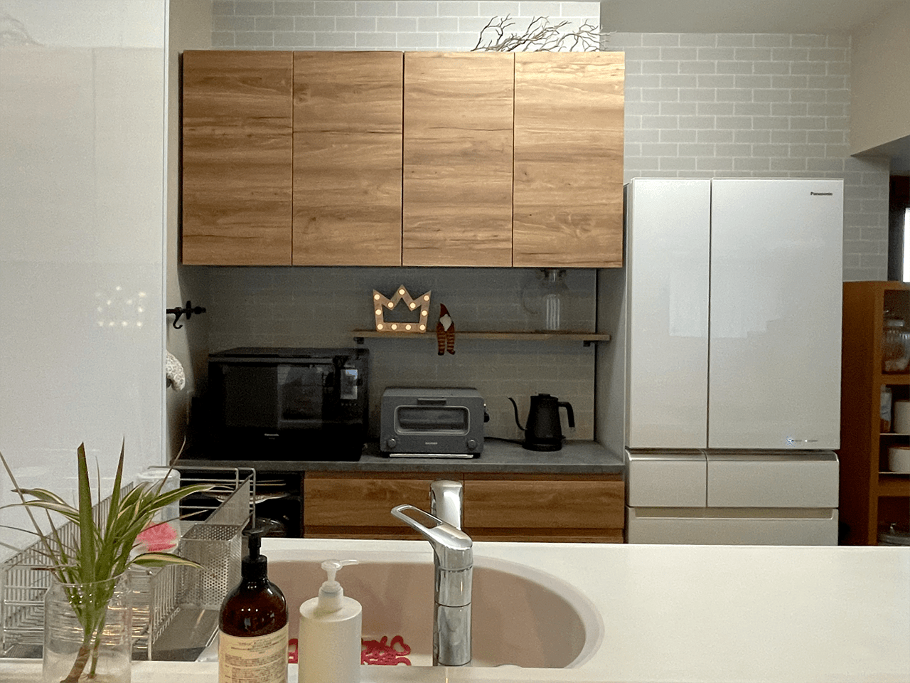 色味を一番こだわりました。部屋全体の統一感を意識してカップボードも色味を検討し、家具はグレー系、天井やテーブルは似ている木の色味を選んでいます。そのほかに、私の背が高いので、吊戸棚を一般的な高さより高い場所に設置し、カウンター上の空間を広くしてもらいました。圧迫感が軽減される見た目になり、のちにカウンター上の空間に飾棚を付けることもできたので満足しています。