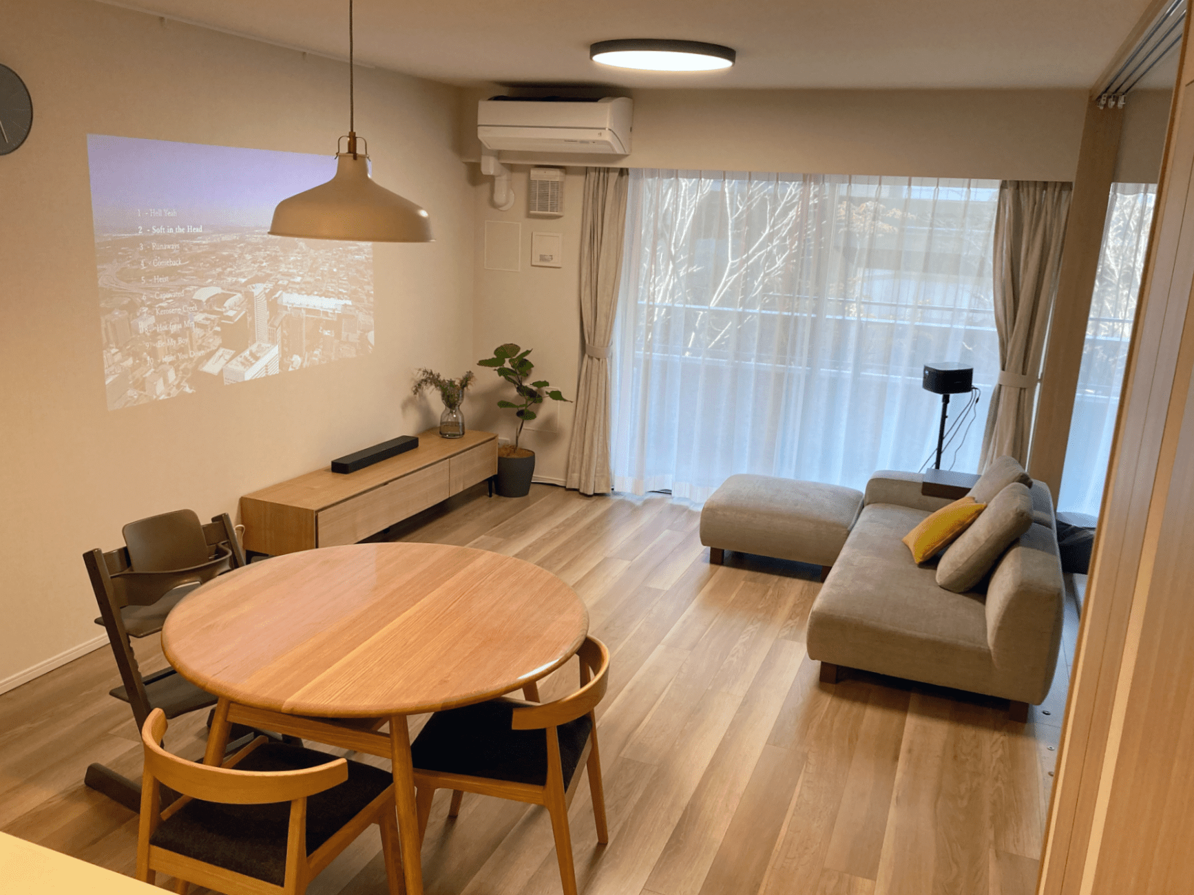 家具以外にも、リネン素材のカーテンを使ったり、TVをプロジェクターで代用したりと、おうちづくりへのこだわりが感じられました。お話を伺っている間には素敵な音楽が流れていて、私も真似したくなるような居心地の良い空間でした。インタビューを終えて帰る際、お子様に可愛らしくお見送りをしていただきました^^ インタビューにご協力いただきまして、誠にありがとうございました。