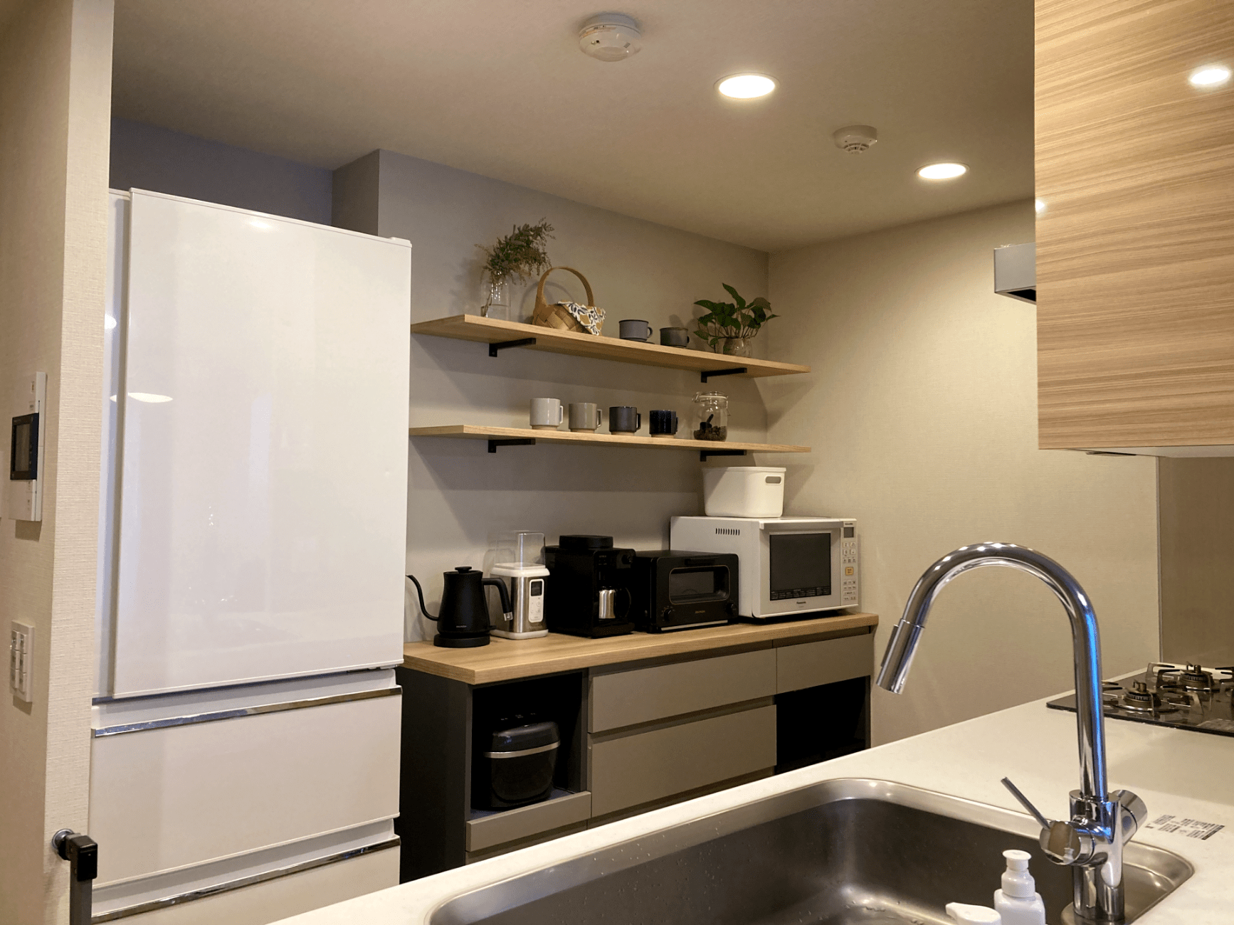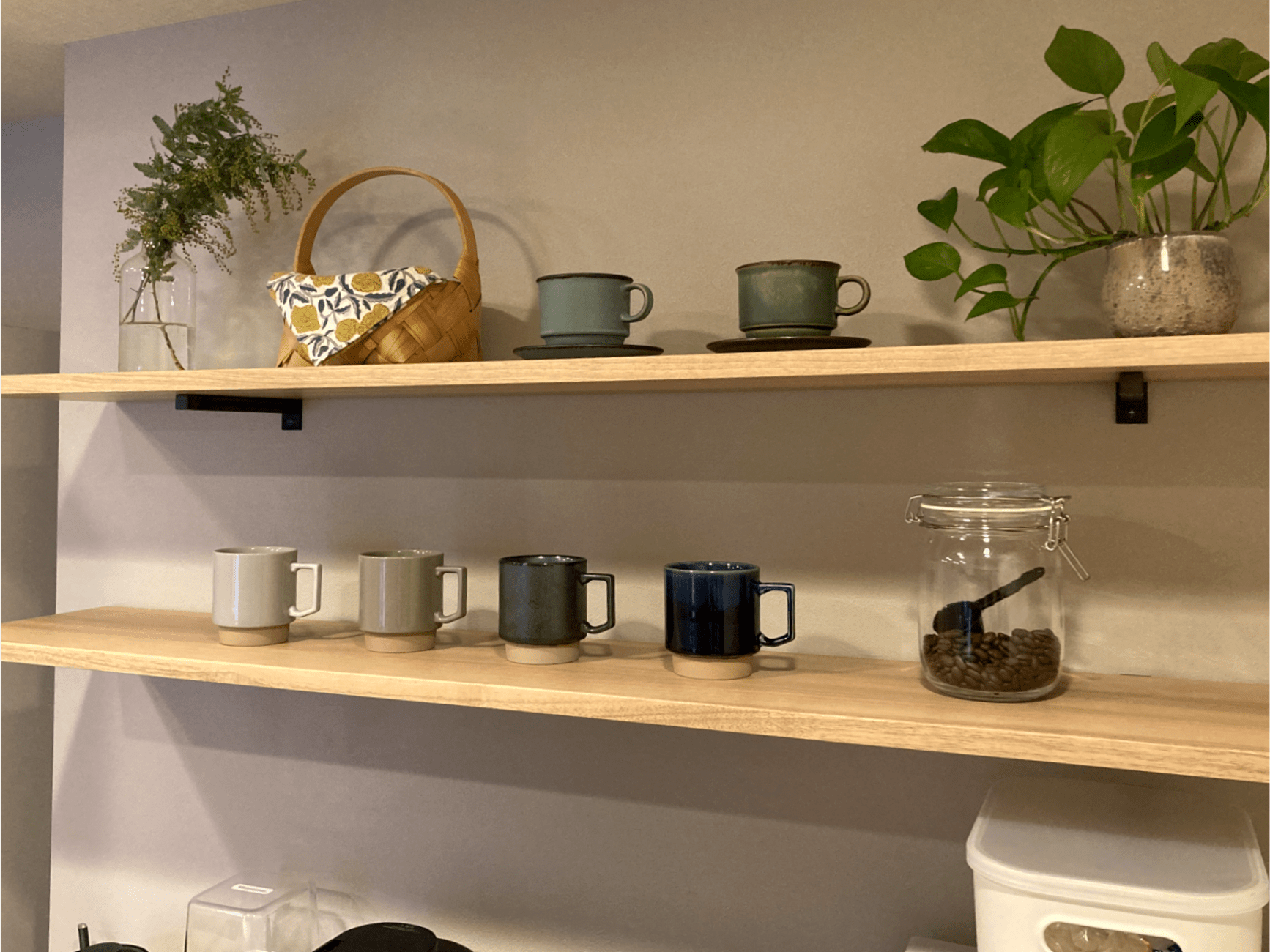 リフォームの際にキッチン背面の壁紙を貼り変えたのですが、壁紙とカップボードの色の組み合わせをこだわりました。それぞれの色味サンプルを並べて何度も検討した甲斐があって、納得のいく色選びができました。①吊戸棚を付けて飾り棚を1枚にするか、②吊戸棚を付けないで飾り棚を2枚にするか、についても設計段階で悩みました。カップボードはリビングからもよく見える場所ですし、圧迫感が無いデザインにもしたかったので吊戸棚がないプランを採用しました。