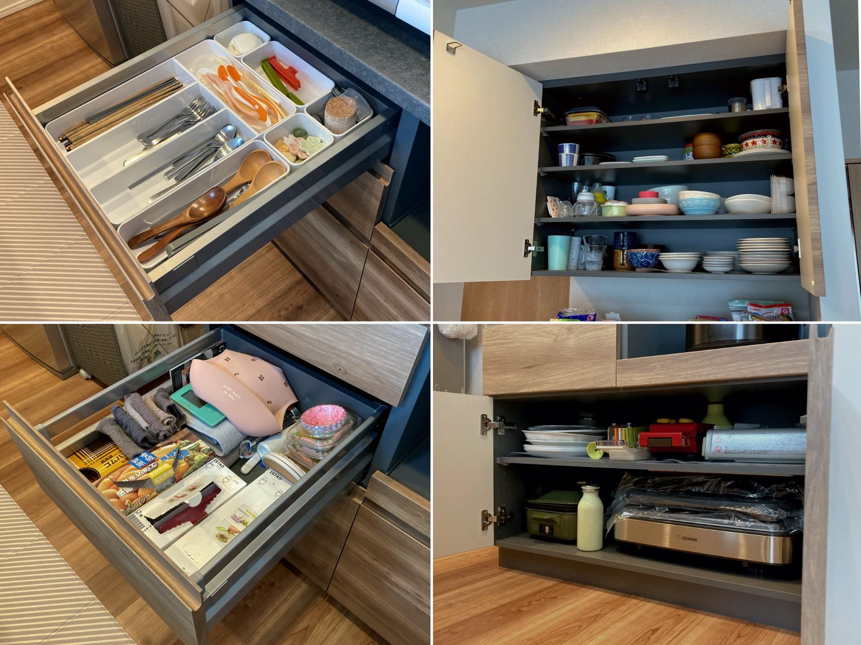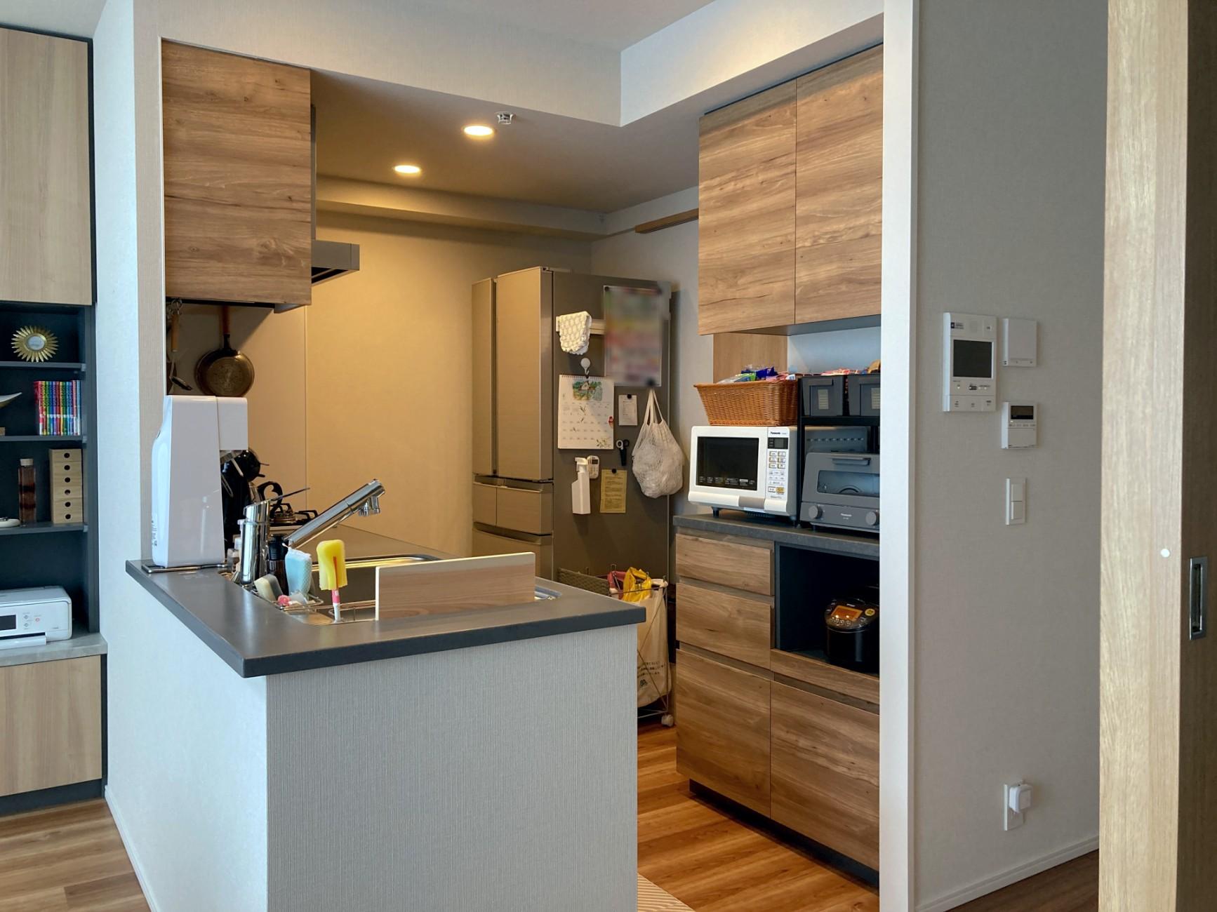 下台と吊戸棚の空間高さは最後まで悩み、最終的には60cmになりました。トースターの上にラックを置くこともでき、吊戸棚にも手が届く高さになったので良かったです。面材選びでは、キッチン扉の色と似たものを選ぶつもりでいたため、今回まさか同じ面材で製作していただけるとは思わず、キッチンに統一感が出すことができました。新居に遊びに来た親戚や友人も備え付けのカップボードだと思い込んでいたようで、オーダーメイドだと伝えるとビックリしていました。