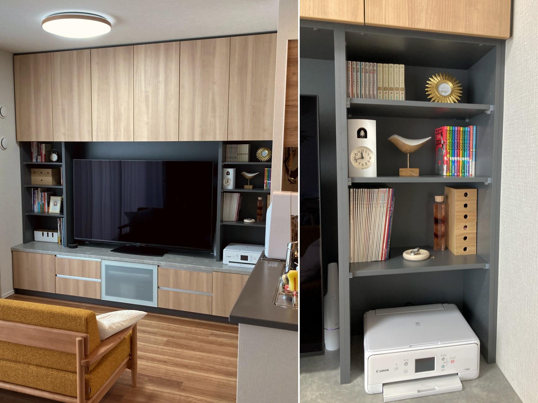 テレビの真下にあるガラス扉にブルーレイディスクプレーヤー、その左右にある引出しには趣味のDVDや細々した物を収納しています。打ち合わせの時からプリンタの置く場所にはとても悩みました。前に住んでいた家ではプリンタを置く場所が無く使うたびに取り出していたため、当初は家具の中に専用の収納スペースを設けようと思っていましたが、これから生活スタイルが変わることも考慮して、現在はカウンターの上に置いて使用しています。