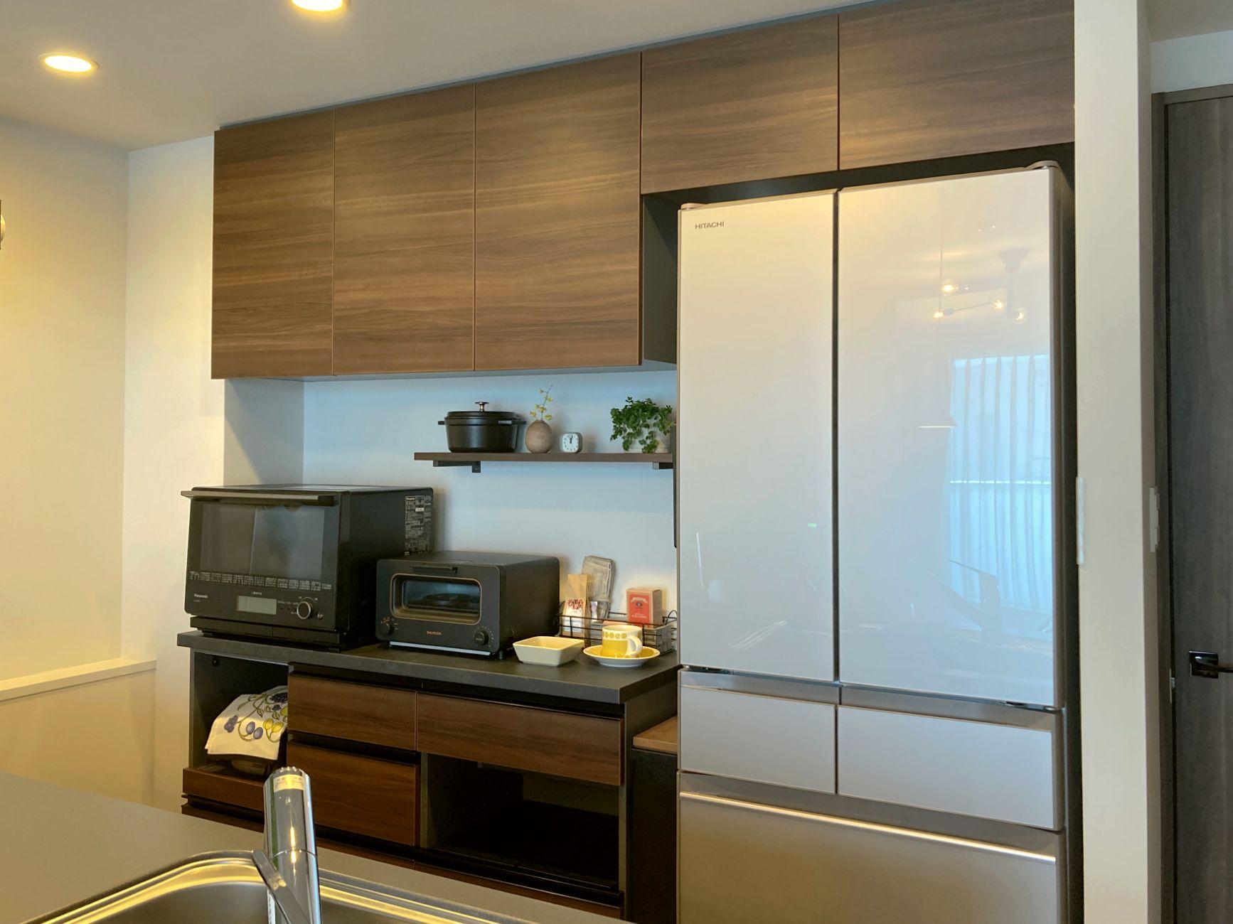 扉や天板の色選びはすごく悩みました。天板はキッチンと違う素材の似た色を検討していましたが、少しだけ似た色にするなら全く違う色にした方がチグハグ感を無くせると思い、キッチンとはガラッと違う濃い色を選びました。扉は、吊戸棚の色を黒やグレー、ショールームで見た明るいブラウンでも悩みました。結果的に、リビングダイニング側からカップボードを見る機会が多いことを考慮して、近くの建具やテーブルと近い色柄の面材にしました。
