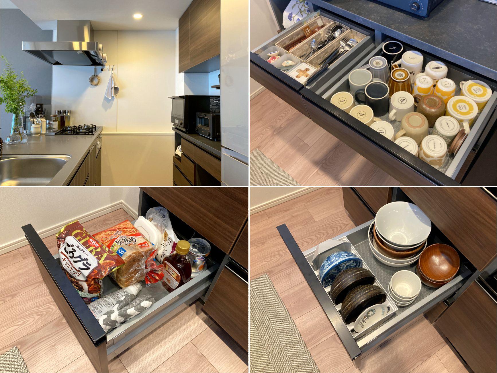 下台の高さが90cmなので、想像していたよりも引出しが深くて使いやすいです。前の家で使っていたカップボードには食パンが入りませんでしたが、今は潰れることなく一番下の引出しに収納できます。引出しの中は、大きなお皿を平置きにし、お茶碗などの食器はトトノのディッシュスタンドを使用しています。家具の設計段階で実際の使い方をイメージするのは難しかったですが、前の家で使っていたカップボードと比べ、「こうだったらいいのに…」を叶えた設計になりました。