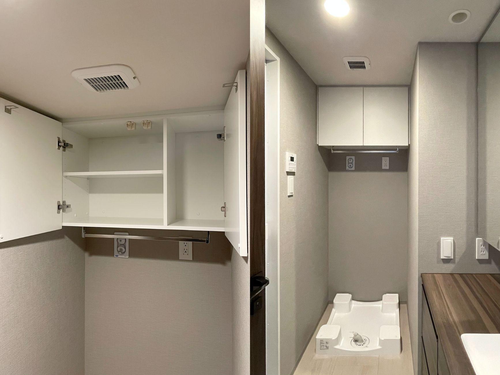 マンションオプションにも洗濯機上収納はありましたが、設計の自由度や価格面を考えて、カップボードと一緒にオーダーしました。暮らし始めたころは右側のスペースにピンチハンガーを立てて収納していましたが、今は高さのある物を収納する場所として使用しています。縦に仕切りが入っているから左右で高さを調節できて使いやすいです。